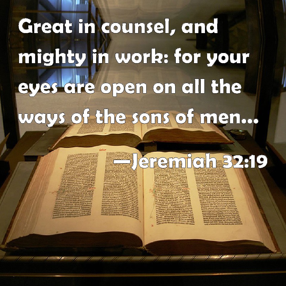 Choose a Background Jeremiah 32:19 Great in counsel, and mighty in work: for your eyes are open on all the ways of the sons of men: to give every one according to his ways, and according to the fruit of his doings: KJV: Great in counsel, and mighty in work: for thine eyes are open upon all the ways of the sons of men: to give every one according to his ways, and according to the fruit of his doings: DRB: Great in counsel and incomprehensible in thought: whose eyes are open upon all the ways of the children of Adam, to render unto every one according to his ways, and according to the fruit of his devices. DBT: great in counsel and mighty in work, whose eyes are open upon all the ways of the children of men, to give every one according to his ways, and according to the fruit of his doings: ERV: great in counsel, and mighty in work: whose eyes are open upon all the ways of the sons of men; to give every one according to his ways, and according to the fruit of his doings: WBT: Great in counsel, and mighty in work: for thy eyes are open upon all the ways of the sons of men: to give every one according to his ways, and according to the fruit of his doings: WEB: great in counsel, and mighty in work; whose eyes are open on all the ways of the sons of men, to give everyone according to his ways, and according to the fruit of his doings: YLT: Great in counsel, and mighty in act, in that Thine eyes are open on all the ways of the sons of Adam, to give to each according to his ways, and according to the fruit of his doings:Links Jeremiah 32:19 NIV • Jeremiah 32:19 NLT • Jeremiah 32:19 ESV • Jeremiah 32:19 NASB • Jeremiah 32:19 KJV • Jeremiah 32:19 Interlinear • Jeremiah 32:19 Commentaries • Jeremiah 32:19 Parallel Texts • Jeremiah 32:19 Bible Apps • Jeremiah 32:19 Parallel • Bible Hub |