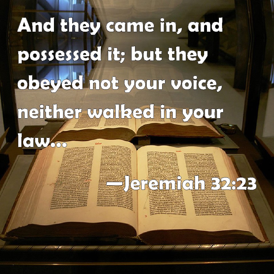 Choose a Background Jeremiah 32:23 And they came in, and possessed it; but they obeyed not your voice, neither walked in your law; they have done nothing of all that you commanded them to do: therefore you have caused all this evil to come on them: KJV: And they came in, and possessed it; but they obeyed not thy voice, neither walked in thy law; they have done nothing of all that thou commandedst them to do: therefore thou hast caused all this evil to come upon them: DRB: And they came in, and possessed it: but they obeyed not thy voice, and they walked not in thy law: and they did not any of those things that thou didst command them to do, and all these evils are come upon them. DBT: And they came in and possessed it: but they hearkened not unto thy voice, neither walked in thy law; they have done nothing of all that thou commandedst them to do; so that thou hast caused all this evil to come upon them. ERV: and they came in, and possessed it; but they obeyed not thy voice, neither walked in thy law; they have done nothing of all that thou commandedst them to do: therefore thou hast caused all this evil to come upon them: WBT: And they came in, and possessed it; but they obeyed not thy voice, neither walked in thy law; they have done nothing of all that thou commandedst them to do: therefore thou hast caused all this evil to come upon them: WEB: and they came in, and possessed it, but they didn't obey your voice, neither walked in your law; they have done nothing of all that you commanded them to do: therefore you have caused all this evil to come on them. YLT: And they come in, and possess it, and they have not hearkened to Thy voice, and in Thy law have not walked, all that which Thou didst lay a charge on them to do they have not done, and Thou dost proclaim to them all this evil.Links Jeremiah 32:23 NIV • Jeremiah 32:23 NLT • Jeremiah 32:23 ESV • Jeremiah 32:23 NASB • Jeremiah 32:23 KJV • Jeremiah 32:23 Interlinear • Jeremiah 32:23 Commentaries • Jeremiah 32:23 Parallel Texts • Jeremiah 32:23 Bible Apps • Jeremiah 32:23 Parallel • Bible Hub |