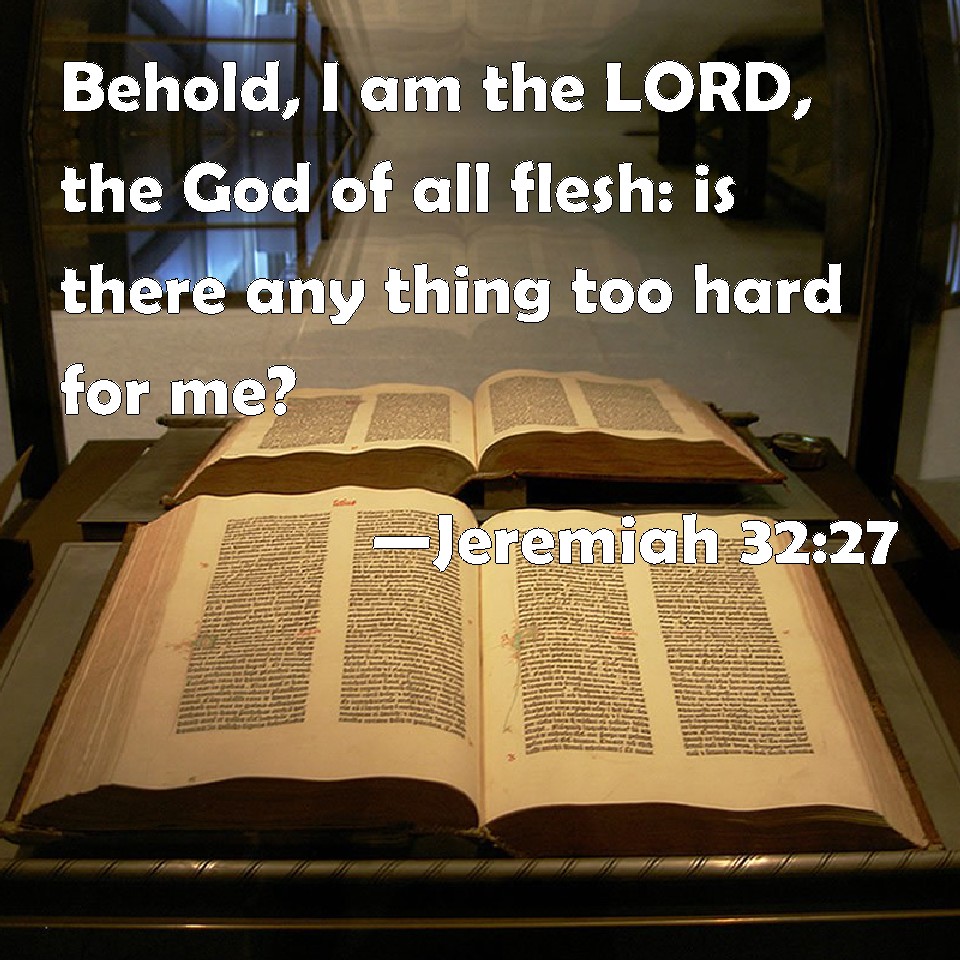 Choose a Background Jeremiah 32:27 Behold, I am the LORD, the God of all flesh: is there any thing too hard for me? KJV: Behold, I am the LORD, the God of all flesh: is there any thing too hard for me? DRB: Behold I am the Lord the God of all flesh: shall any thing be hard for me? DBT: Behold, I am Jehovah, the God of all flesh: is there anything too hard for me? ERV: Behold, I am the LORD, the God of all flesh: is there any thing too hard for me? WBT: Behold, I am the LORD, the God of all flesh: is there any thing too hard for me? WEB: Behold, I am Yahweh, the God of all flesh: is there anything too hard for me? YLT: Lo, I am Jehovah, God of all flesh: For Me is anything too wonderful?Links Jeremiah 32:27 NIV • Jeremiah 32:27 NLT • Jeremiah 32:27 ESV • Jeremiah 32:27 NASB • Jeremiah 32:27 KJV • Jeremiah 32:27 Interlinear • Jeremiah 32:27 Commentaries • Jeremiah 32:27 Parallel Texts • Jeremiah 32:27 Bible Apps • Jeremiah 32:27 Parallel • Bible Hub |