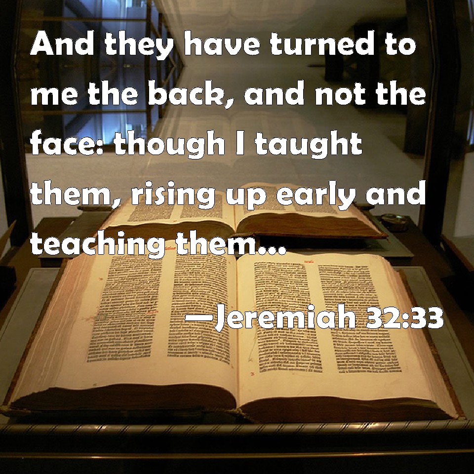 Choose a Background Jeremiah 32:33 And they have turned to me the back, and not the face: though I taught them, rising up early and teaching them, yet they have not listened to receive instruction. KJV: And they have turned unto me the back, and not the face: though I taught them, rising up early and teaching them, yet they have not hearkened to receive instruction. DRB: And they have turned their backs to me, and not their faces: when I taught them early in the morning, and instructed them, and they would not hearken to receive instruction. DBT: And they have turned unto me the back, and not the face; and though I taught them, rising early and teaching, they hearkened not to receive instruction. ERV: And they have turned unto me the back, and not the face: and though I taught them, rising up early and teaching them, yet they have not hearkened to receive instruction. WBT: And they have turned to me the back, and not the face: though I taught them, rising early and teaching them, yet they have not hearkened to receive instruction. WEB: They have turned to me the back, and not the face: and though I taught them, rising up early and teaching them, yet they have not listened to receive instruction. YLT: And they turn unto Me the neck, and not the face, and teaching them, rising early and teaching, and they are not hearkening to accept instruction.Links Jeremiah 32:33 NIV • Jeremiah 32:33 NLT • Jeremiah 32:33 ESV • Jeremiah 32:33 NASB • Jeremiah 32:33 KJV • Jeremiah 32:33 Interlinear • Jeremiah 32:33 Commentaries • Jeremiah 32:33 Parallel Texts • Jeremiah 32:33 Bible Apps • Jeremiah 32:33 Parallel • Bible Hub |