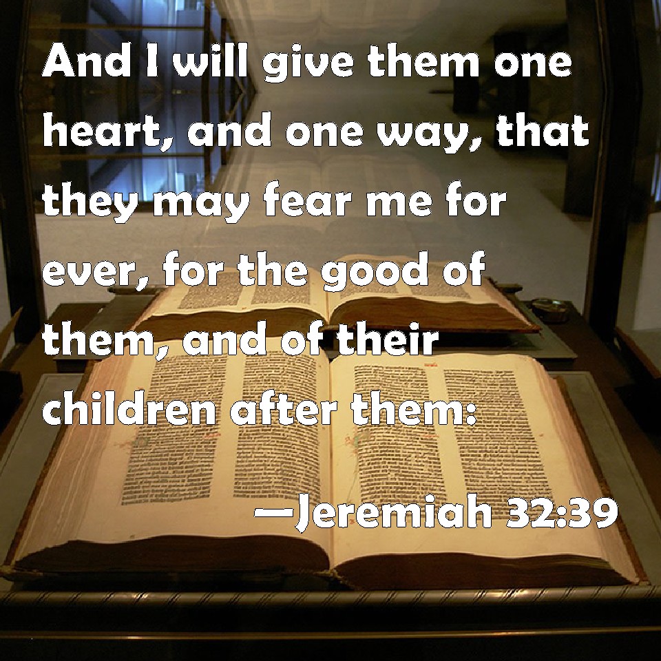 Choose a Background Jeremiah 32:39 And I will give them one heart, and one way, that they may fear me for ever, for the good of them, and of their children after them: KJV: And I will give them one heart, and one way, that they may fear me for ever, for the good of them, and of their children after them: DRB: And I will give them one heart, and one way, that they may fear me all days : and that it may be well with them, and with their children after them. DBT: And I will give them one heart, and one way, that they may fear me all their days, for the good of them, and of their children after them. ERV: and I will give them one heart and one way, that they may fear me for ever; for the good of them, and of their children after them: WBT: And I will give them one heart, and one way, that they may fear me for ever, for the good of them, and of their children after them: WEB: and I will give them one heart and one way, that they may fear me forever, for the good of them, and of their children after them: YLT: and I have given to them one heart, and one way, to fear Me all the days, for good to them, and to their sons after them:Links Jeremiah 32:39 NIV • Jeremiah 32:39 NLT • Jeremiah 32:39 ESV • Jeremiah 32:39 NASB • Jeremiah 32:39 KJV • Jeremiah 32:39 Interlinear • Jeremiah 32:39 Commentaries • Jeremiah 32:39 Parallel Texts • Jeremiah 32:39 Bible Apps • Jeremiah 32:39 Parallel • Bible Hub |