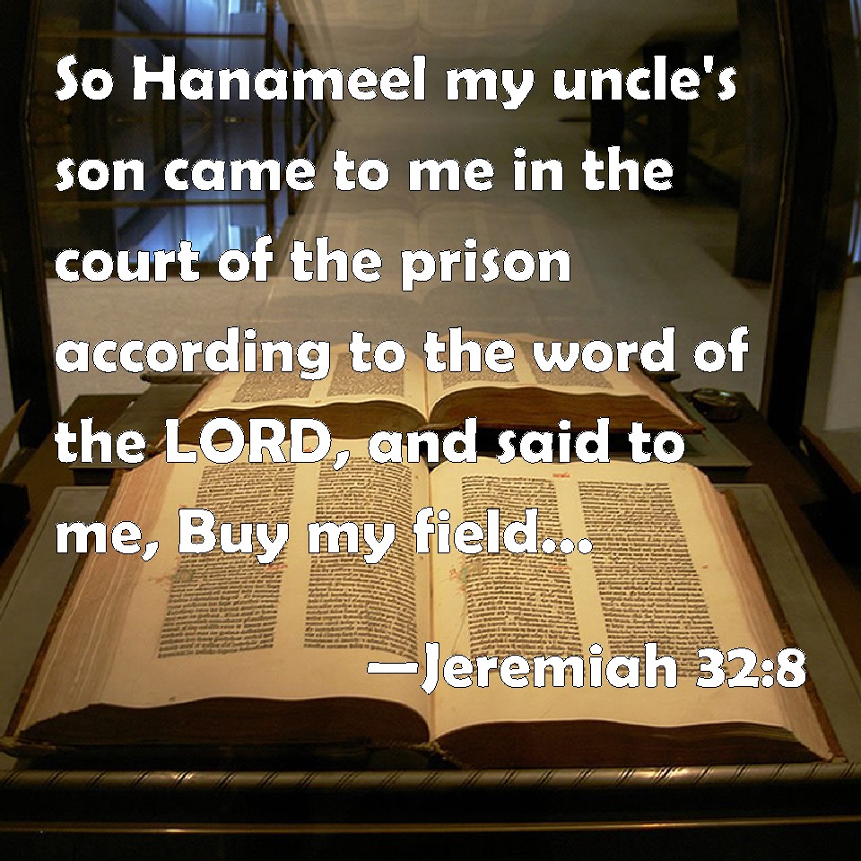 KJV:  So Hanameel mine uncle's son came to me in the court of the prison according to the word of the LORD, and said unto me, Buy my field, I pray thee, that is in Anathoth, which is in the country of Benjamin: for the right of inheritance is thine, and the redemption is thine; buy it for thyself. Then I knew that this was the word of the LORD.
