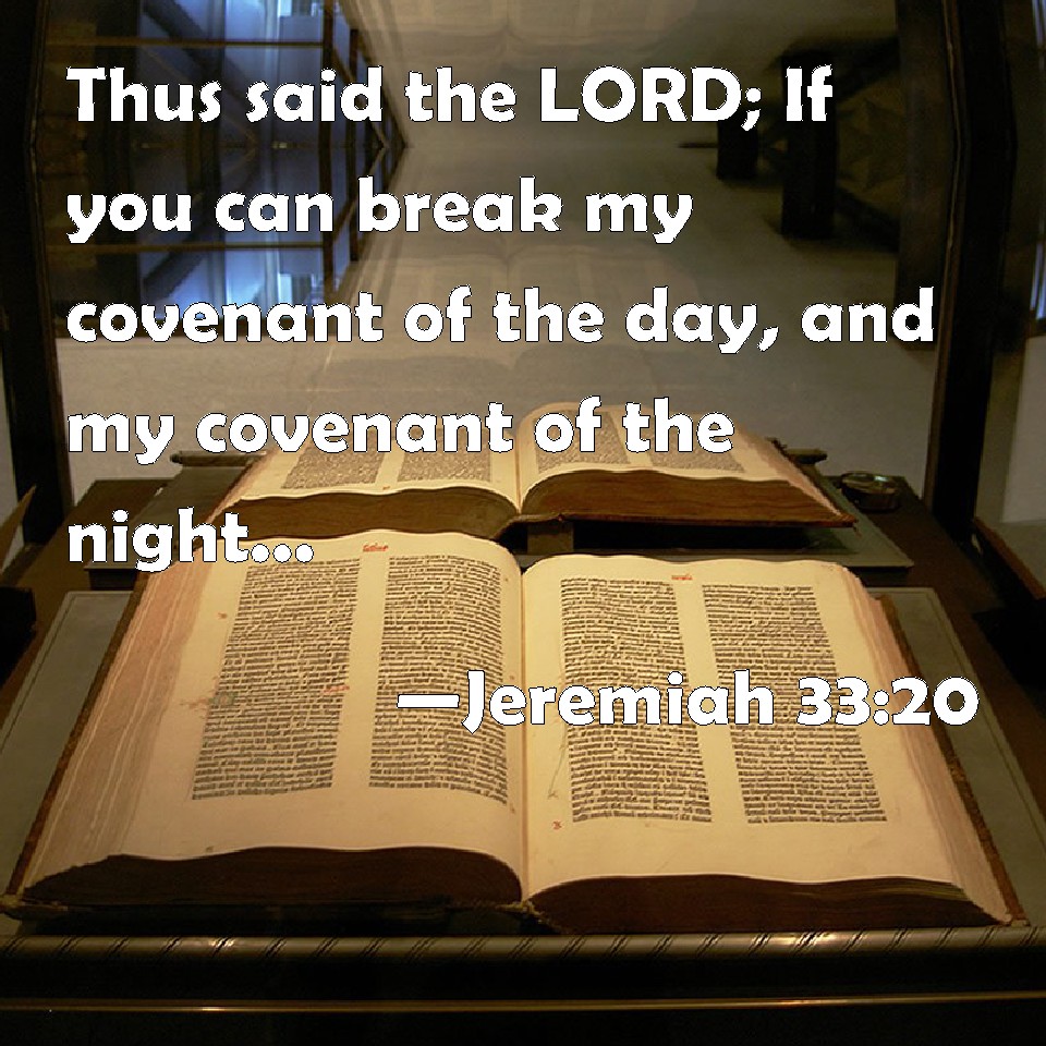 Choose a Background Jeremiah 33:20 Thus said the LORD; If you can break my covenant of the day, and my covenant of the night, and that there should not be day and night in their season; KJV: Thus saith the LORD; If ye can break my covenant of the day, and my covenant of the night, and that there should not be day and night in their season; DRB: Thus saith the Lord: If my covenant with the day can be made void, and my covenant with the night, that there should not be day and night in their season: DBT: Thus saith Jehovah: If ye can break my covenant in respect of the day, and my covenant in respect of the night, so that there should not be day and night in their season, ERV: Thus saith the LORD: If ye can break my covenant of the day, and my covenant of the night, so that there should not be day and night in their season; WBT: Thus saith the LORD; If ye can break my covenant of the day, and my covenant of the night, so that there should not be day and night in their season; WEB: Thus says Yahweh: If you can break my covenant of the day, and my covenant of the night, so that there shall not be day and night in their season; YLT: 'Thus said Jehovah: If ye do break My covenant of the day, And My covenant of the night, So that they are not daily and nightly in their season,Links Jeremiah 33:20 NIV • Jeremiah 33:20 NLT • Jeremiah 33:20 ESV • Jeremiah 33:20 NASB • Jeremiah 33:20 KJV • Jeremiah 33:20 Interlinear • Jeremiah 33:20 Commentaries • Jeremiah 33:20 Parallel Texts • Jeremiah 33:20 Bible Apps • Jeremiah 33:20 Parallel • Bible Hub |