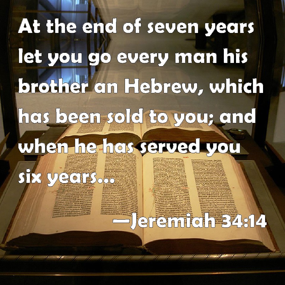 Choose a Background Jeremiah 34:14 At the end of seven years let you go every man his brother an Hebrew, which has been sold to you; and when he has served you six years, you shall let him go free from you: but your fathers listened not to me, neither inclined their ear. KJV: At the end of seven years let ye go every man his brother an Hebrew, which hath been sold unto thee; and when he hath served thee six years, thou shalt let him go free from thee: but your fathers hearkened not unto me, neither inclined their ear. DRB: At the end of seven years, let ye go every man his brother being a Hebrew, who hath been sold to thee, so he shall serve thee six years: and thou shalt let him go free from thee: and your fathers did not hearken to me, nor did they incline their ear. DBT: At the end of seven years ye shall let go every man his brother, a Hebrew, who hath sold himself unto thee; when he hath served thee six years, thou shalt let him go free from thee. But your fathers hearkened not unto me, neither inclined their ear. ERV: At the end of seven years ye shall let go every man his brother that is an Hebrew, which hath been sold unto thee, and hath served thee six years, thou shalt let him go free from thee: but your fathers hearkened not unto me, neither inclined their ear. WBT: At the end of seven years dismiss ye every man his brother a Hebrew, who hath been sold to thee; and when he hath served thee six years, thou shalt let him go free from thee: but your fathers hearkened not to me, neither inclined their ear. WEB: At the end of seven years you shall let go every man his brother who is a Hebrew, who has been sold to you, and has served you six years, you shall let him go free from you: but your fathers didn't listen to me, neither inclined their ear. YLT: At the end of seven years ye do send forth each his brother, the Hebrew, who is sold to thee, and hath served thee six years, yea, thou hast sent him forth free from thee: and your fathers hearkened not unto Me, nor inclined their ear.Links Jeremiah 34:14 NIV • Jeremiah 34:14 NLT • Jeremiah 34:14 ESV • Jeremiah 34:14 NASB • Jeremiah 34:14 KJV • Jeremiah 34:14 Interlinear • Jeremiah 34:14 Commentaries • Jeremiah 34:14 Parallel Texts • Jeremiah 34:14 Bible Apps • Jeremiah 34:14 Parallel • Bible Hub |