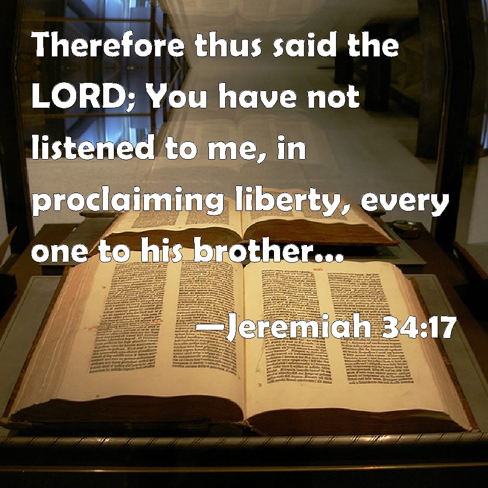 Choose a Background Jeremiah 34:17 Therefore thus said the LORD; You have not listened to me, in proclaiming liberty, every one to his brother, and every man to his neighbor: behold, I proclaim a liberty for you, said the LORD, to the sword, to the pestilence, and to the famine; and I will make you to be removed into all the kingdoms of the earth. KJV: Therefore thus saith the LORD; Ye have not hearkened unto me, in proclaiming liberty, every one to his brother, and every man to his neighbour: behold, I proclaim a liberty for you, saith the LORD, to the sword, to the pestilence, and to the famine; and I will make you to be removed into all the kingdoms of the earth. DRB: Therefore thus saith the Lord: You have not hearkened to me, in proclaiming liberty every man to his brother and every man to his friend: behold I proclaim a liberty for you, saith the Lord, to the sword, to the pestilence, and to the famine: and I will cause you to be removed to all the kingdoms of the earth. DBT: Therefore thus saith Jehovah: Ye have not hearkened unto me, in proclaiming liberty, every man to his brother, and every man to his neighbour: behold, I proclaim a liberty for you, saith Jehovah, to the sword, to the pestilence, and to the famine; and I will give you over to be driven hither and thither among all the kingdoms of the earth. ERV: Therefore thus saith the LORD: Ye have not hearkened unto me, to proclaim liberty, every man to his brother, and every man to his neighbour: behold, I proclaim unto you a liberty, saith the LORD, to the sword, to the pestilence, and to the famine; and I will make you to be tossed to and fro among all the kingdoms of the earth. WBT: Therefore thus saith the LORD; Ye have not hearkened to me, in proclaiming liberty, every one to his brother, and every man to his neighbor: behold, I proclaim a liberty for you, saith the LORD, to the sword, to the pestilence, and to the famine; and I will make you to be removed into all the kingdoms of the earth. WEB: Therefore thus says Yahweh: you have not listened to me, to proclaim liberty, every man to his brother, and every man to his neighbor: behold, I proclaim to you a liberty, says Yahweh, to the sword, to the pestilence, and to the famine; and I will make you to be tossed back and forth among all the kingdoms of the earth. YLT: Therefore, thus said Jehovah: Ye have not hearkened unto Me to proclaim freedom, each to his brother, and each to his neighbour; lo, I am proclaiming to you liberty — an affirmation of Jehovah — unto the sword, unto the pestilence, and unto the famine, and I have given you for a trembling to all kingdoms of the earth.Links Jeremiah 34:17 NIV • Jeremiah 34:17 NLT • Jeremiah 34:17 ESV • Jeremiah 34:17 NASB • Jeremiah 34:17 KJV • Jeremiah 34:17 Interlinear • Jeremiah 34:17 Commentaries • Jeremiah 34:17 Parallel Texts • Jeremiah 34:17 Bible Apps • Jeremiah 34:17 Parallel • Bible Hub |