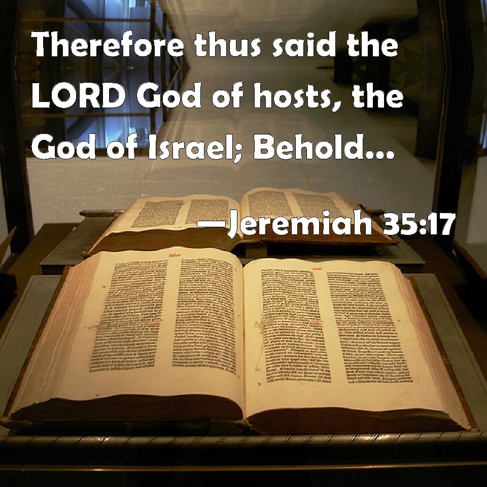 Choose a Background Jeremiah 35:17 Therefore thus said the LORD God of hosts, the God of Israel; Behold, I will bring on Judah and on all the inhabitants of Jerusalem all the evil that I have pronounced against them: because I have spoken to them, but they have not heard; and I have called to them, but they have not answered. KJV: Therefore thus saith the LORD God of hosts, the God of Israel; Behold, I will bring upon Judah and upon all the inhabitants of Jerusalem all the evil that I have pronounced against them: because I have spoken unto them, but they have not heard; and I have called unto them, but they have not answered. DRB: Therefore thus saith the Lord of hosts the God of Israel: Behold I will bring upon Juda, and upon all the inhabitants of Jerusalem all the evil that I have pronounced against them, because I have spoken to them, and they have not heard: I have called to them, and they have not answered me. DBT: therefore thus saith Jehovah the God of hosts, the God of Israel: Behold, I will bring upon Judah and upon all the inhabitants of Jerusalem all the evil that I have pronounced against them, because I have spoken unto them, but they have not hearkened, and I have called unto them, but they have not answered. ERV: therefore thus saith the LORD, the God of hosts, the God of Israel: Behold, I will bring upon Judah and upon all the inhabitants of Jerusalem all the evil that I have pronounced against them: because I have spoken unto them, but they have not heard; and I have called unto them, but they have not answered. WBT: Therefore thus saith the LORD God of hosts, the God of Israel; Behold, I will bring upon Judah and upon all the inhabitants of Jerusalem all the evil that I have pronounced against them; because I have spoken to them, but they have not heard; and I have called to them, but they have not answered. WEB: therefore thus says Yahweh, the God of Armies, the God of Israel: Behold, I will bring on Judah and on all the inhabitants of Jerusalem all the evil that I have pronounced against them; because I have spoken to them, but they have not heard; and I have called to them, but they have not answered. YLT: therefore thus said Jehovah, God of Hosts, God of Israel: Lo, I am bringing in unto Judah, and unto all inhabitants of Jerusalem, all the evil that I have spoken against them, because I have spoken unto them, and they have not hearkened, yea, I call to them, and they have not answered.'Links Jeremiah 35:17 NIV • Jeremiah 35:17 NLT • Jeremiah 35:17 ESV • Jeremiah 35:17 NASB • Jeremiah 35:17 KJV • Jeremiah 35:17 Interlinear • Jeremiah 35:17 Commentaries • Jeremiah 35:17 Parallel Texts • Jeremiah 35:17 Bible Apps • Jeremiah 35:17 Parallel • Bible Hub |