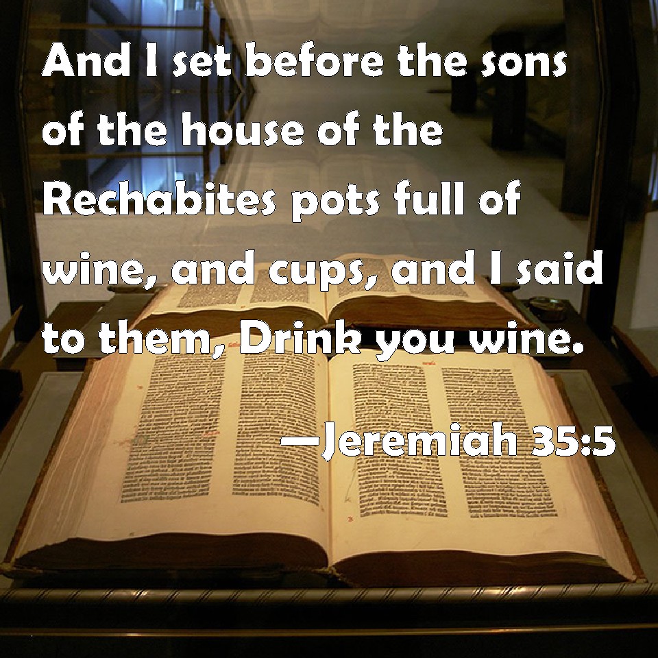 Choose a Background Jeremiah 35:5 And I set before the sons of the house of the Rechabites pots full of wine, and cups, and I said to them, Drink you wine. KJV: And I set before the sons of the house of the Rechabites pots full of wine, and cups, and I said unto them, Drink ye wine. DRB: And I set before the sons of the house of the Rechabites pots full of wine, and cups: and I said to them: Drink ye wine. DBT: And I set before the sons of the house of the Rechabites bowls full of wine, and cups, and I said unto them, Drink wine. ERV: And I set before the sons of the house of the Rechabites bowls full of wine, and cups, and I said unto them, Drink ye wine. WBT: And I set before the sons of the house of the Rechabites pots full of wine, and cups, and I said to them, Drink ye wine. WEB: I set before the sons of the house of the Rechabites bowls full of wine, and cups; and I said to them, Drink wine! YLT: and I put before the sons of the house of the Rechabites goblets full of wine, and cups, and I say unto them, Drink ye wine.Links Jeremiah 35:5 NIV • Jeremiah 35:5 NLT • Jeremiah 35:5 ESV • Jeremiah 35:5 NASB • Jeremiah 35:5 KJV • Jeremiah 35:5 Interlinear • Jeremiah 35:5 Commentaries • Jeremiah 35:5 Parallel Texts • Jeremiah 35:5 Bible Apps • Jeremiah 35:5 Parallel • Bible Hub |