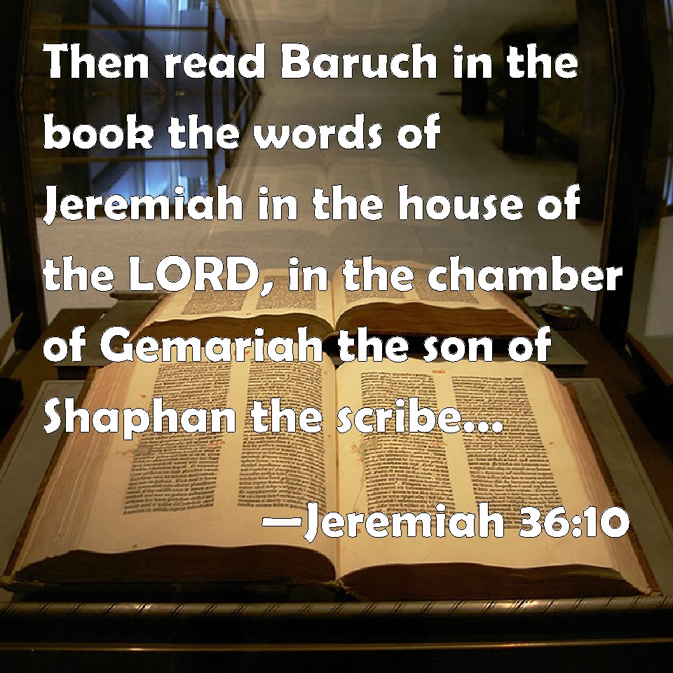 Choose a Background Jeremiah 36:10 Then read Baruch in the book the words of Jeremiah in the house of the LORD, in the chamber of Gemariah the son of Shaphan the scribe, in the higher court, at the entry of the new gate of the LORD's house, in the ears of all the people. KJV: Then read Baruch in the book the words of Jeremiah in the house of the LORD, in the chamber of Gemariah the son of Shaphan the scribe, in the higher court, at the entry of the new gate of the LORD'S house, in the ears of all the people. DRB: And Baruch read out of the volume the words of Jeremias in the house of the Lord, in the treasury of Gamarias the son of Saphan the scribe, in the upper court, in the entry of the new gate of the house of the Lord, in the hearing of all the people. DBT: And Baruch read in the book the words of Jeremiah in the house of Jehovah, in the chamber of Gemariah the son of Shaphan the scribe, in the upper court, at the entry of the new gate of the house of Jehovah, in the ears of all the people. ERV: Then read Baruch in the book the words of Jeremiah in the house of the LORD, in the chamber of Gemariah the son of Shaphan the scribe, in the upper court, at the entry of the new gate of the LORD'S house, in the ears of all the people. WBT: Then Baruch read in the book the words of Jeremiah in the house of the LORD, in the chamber of Gemariah the son of Shaphan the scribe, in the higher court, at the entry of the new gate of the LORD'S house, in the ears of all the people. WEB: Then read Baruch in the book the words of Jeremiah in the house of Yahweh, in the room of Gemariah the son of Shaphan, the scribe, in the upper court, at the entry of the new gate of Yahweh's house, in the ears of all the people. YLT: and Baruch readeth in the book the words of Jeremiah in the house of Jehovah, in the chamber of Gemariah son of Shaphan the scribe, in the higher court, at the opening of the new gate of the house of Jehovah, in the ears of all the people.Links Jeremiah 36:10 NIV • Jeremiah 36:10 NLT • Jeremiah 36:10 ESV • Jeremiah 36:10 NASB • Jeremiah 36:10 KJV • Jeremiah 36:10 Interlinear • Jeremiah 36:10 Commentaries • Jeremiah 36:10 Parallel Texts • Jeremiah 36:10 Bible Apps • Jeremiah 36:10 Parallel • Bible Hub |