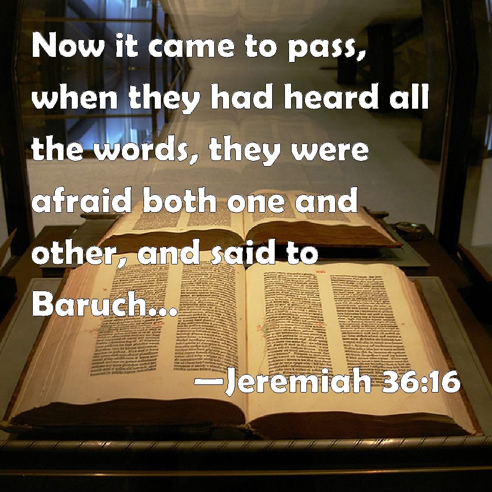 Choose a Background Jeremiah 36:16 Now it came to pass, when they had heard all the words, they were afraid both one and other, and said to Baruch, We will surely tell the king of all these words. KJV: Now it came to pass, when they had heard all the words, they were afraid both one and other, and said unto Baruch, We will surely tell the king of all these words. DRB: And when they had heard all the words, they looked upon one another with astonishment, and they said to Baruch: We must tell the king all these words. DBT: And it came to pass, when they heard all the words, they turned in fear one toward another, and said unto Baruch, We will certainly report to the king all these words. ERV: Now it came to pass, when they had heard all the words, they turned in fear one toward another, and said unto Baruch, We will surely tell the king of all these words. WBT: Now it came to pass when they had heard all the words, they were afraid both one and another, and said to Baruch, We will surely tell the king of all these words. WEB: Now it happened, when they had heard all the words, they turned in fear one toward another, and said to Baruch, We will surely tell the king of all these words. YLT: and it cometh to pass, when they hear all the words, they have been afraid one at another, and say unto Baruch, 'We do surely declare to the king all these words.'Links Jeremiah 36:16 NIV • Jeremiah 36:16 NLT • Jeremiah 36:16 ESV • Jeremiah 36:16 NASB • Jeremiah 36:16 KJV • Jeremiah 36:16 Interlinear • Jeremiah 36:16 Commentaries • Jeremiah 36:16 Parallel Texts • Jeremiah 36:16 Bible Apps • Jeremiah 36:16 Parallel • Bible Hub |