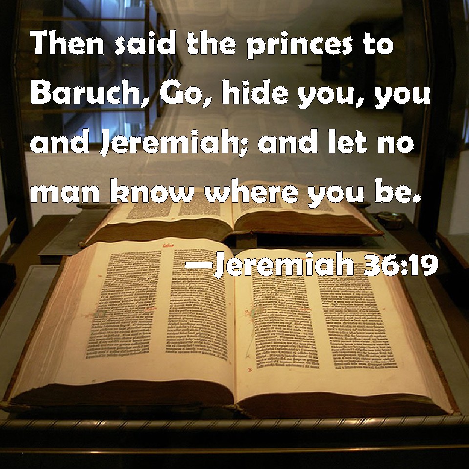 Choose a Background Jeremiah 36:19 Then said the princes to Baruch, Go, hide you, you and Jeremiah; and let no man know where you be. KJV: Then said the princes unto Baruch, Go, hide thee, thou and Jeremiah; and let no man know where ye be. DRB: And the princes said to Baruch: Go, and hide thee, both thou and Jeremias, and let no man know where you are. DBT: And the princes said unto Baruch, Go, hide thee, thou and Jeremiah; that none may know where ye are. ERV: Then said the princes unto Baruch, Go, hide thee, thou and Jeremiah; and let no man know where ye be. WBT: Then said the princes to Baruch, Go, hide thyself, thou and Jeremiah; and let no man know where ye are. WEB: Then the princes said to Baruch, Go, hide, you and Jeremiah; and let no man know where you are. YLT: And the heads say unto Baruch, 'Go, be hidden, thou and Jeremiah, and let no one know where ye are.'Links Jeremiah 36:19 NIV • Jeremiah 36:19 NLT • Jeremiah 36:19 ESV • Jeremiah 36:19 NASB • Jeremiah 36:19 KJV • Jeremiah 36:19 Interlinear • Jeremiah 36:19 Commentaries • Jeremiah 36:19 Parallel Texts • Jeremiah 36:19 Bible Apps • Jeremiah 36:19 Parallel • Bible Hub |