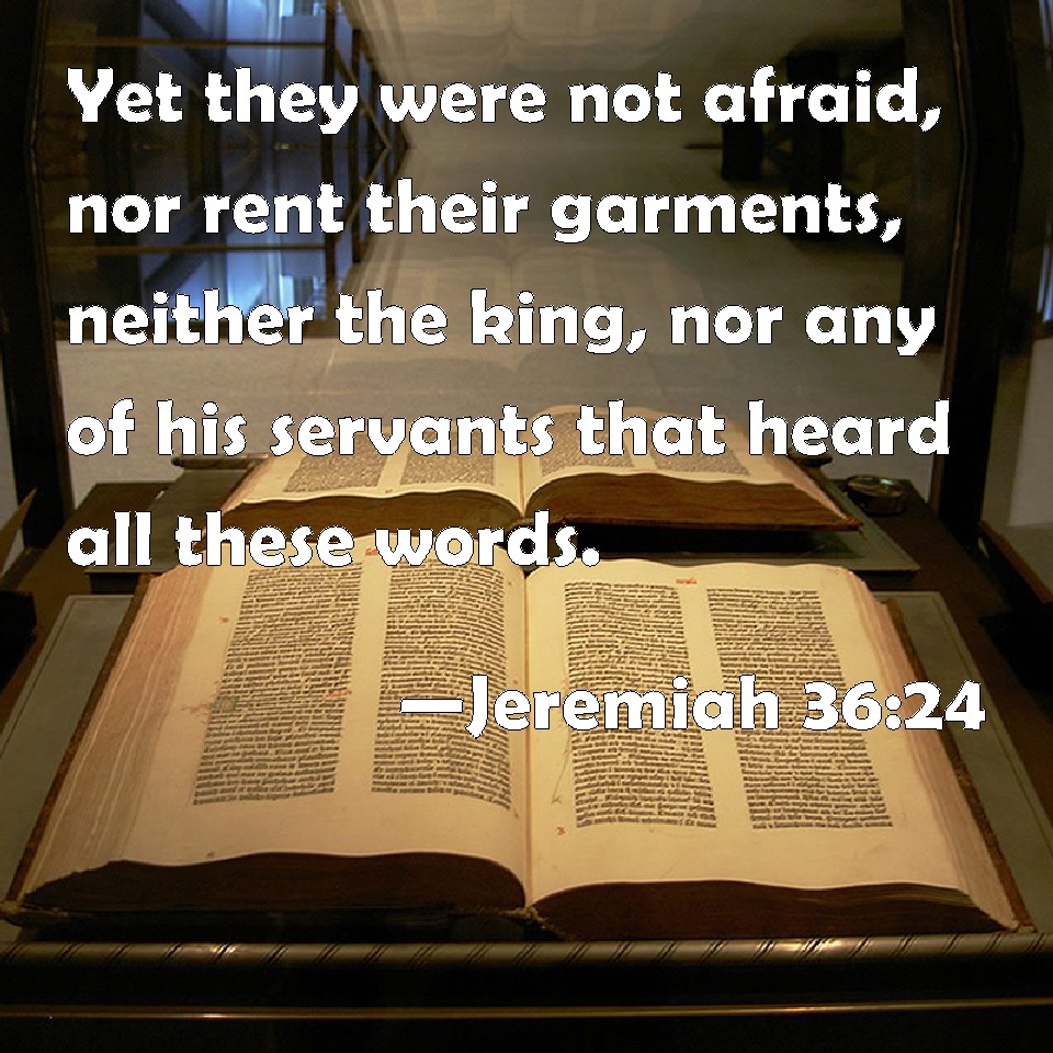 Choose a Background Jeremiah 36:24 Yet they were not afraid, nor rent their garments, neither the king, nor any of his servants that heard all these words. KJV: Yet they were not afraid, nor rent their garments, neither the king, nor any of his servants that heard all these words. DRB: And the king and all his servants that heard all these words were not afraid, nor did they rend their garments. DBT: And they were not afraid, nor rent their garments, neither the king nor any of his servants that heard all these words. ERV: And they were not afraid, nor rent their garments, neither the king, nor any of his servants that heard all these words. WBT: Yet they were not afraid, nor rent their garments, neither the king, nor any of his servants that heard all these words. WEB: They were not afraid, nor tore their garments, neither the king, nor any of his servants who heard all these words. YLT: And the king and all his servants who are hearing all these words have not been afraid, nor rent their garments.Links Jeremiah 36:24 NIV • Jeremiah 36:24 NLT • Jeremiah 36:24 ESV • Jeremiah 36:24 NASB • Jeremiah 36:24 KJV • Jeremiah 36:24 Interlinear • Jeremiah 36:24 Commentaries • Jeremiah 36:24 Parallel Texts • Jeremiah 36:24 Bible Apps • Jeremiah 36:24 Parallel • Bible Hub |