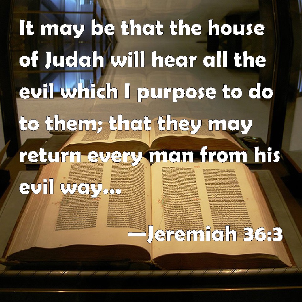 Jeremiah 36:3 It may be that the house of Judah will hear all the evil which I purpose to do to them; that they may return every man from his evil way; that I may forgive their iniquity and their sin.