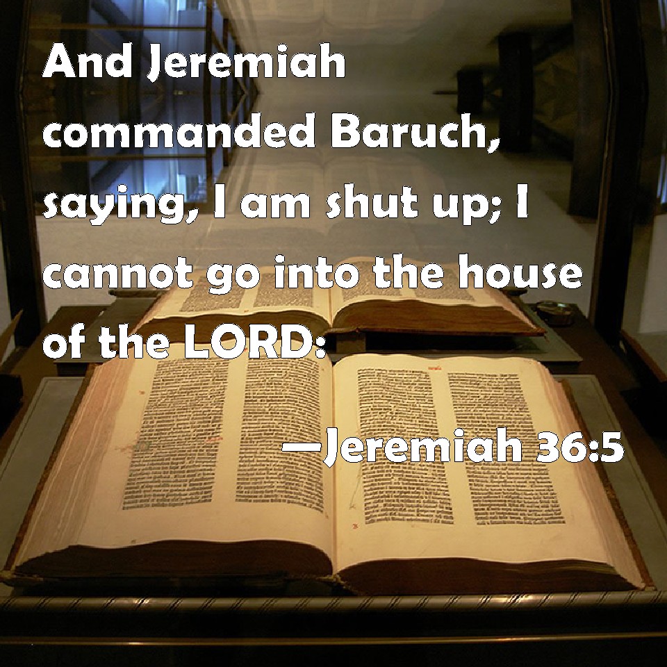 Choose a Background Jeremiah 36:5 And Jeremiah commanded Baruch, saying, I am shut up; I cannot go into the house of the LORD: KJV: And Jeremiah commanded Baruch, saying, I am shut up; I cannot go into the house of the LORD: DRB: And Jeremias commanded Baruch, saying: I am shut up, and cannot go into the house of the Lord. DBT: And Jeremiah commanded Baruch, saying, I am shut up, I cannot go into the house of Jehovah; but go thou in, ERV: And Jeremiah commanded Baruch, saying, I am shut up; I cannot go into the house of the LORD: WBT: And Jeremiah commanded Baruch, saying, I am confined, I cannot go into the house of the LORD: WEB: Jeremiah commanded Baruch, saying, I am shut up; I can't go into the house of Yahweh: YLT: And Jeremiah commandeth Baruch, saying, 'I am restrained, I am not able to enter the house of Jehovah;Links Jeremiah 36:5 NIV • Jeremiah 36:5 NLT • Jeremiah 36:5 ESV • Jeremiah 36:5 NASB • Jeremiah 36:5 KJV • Jeremiah 36:5 Interlinear • Jeremiah 36:5 Commentaries • Jeremiah 36:5 Parallel Texts • Jeremiah 36:5 Bible Apps • Jeremiah 36:5 Parallel • Bible Hub |