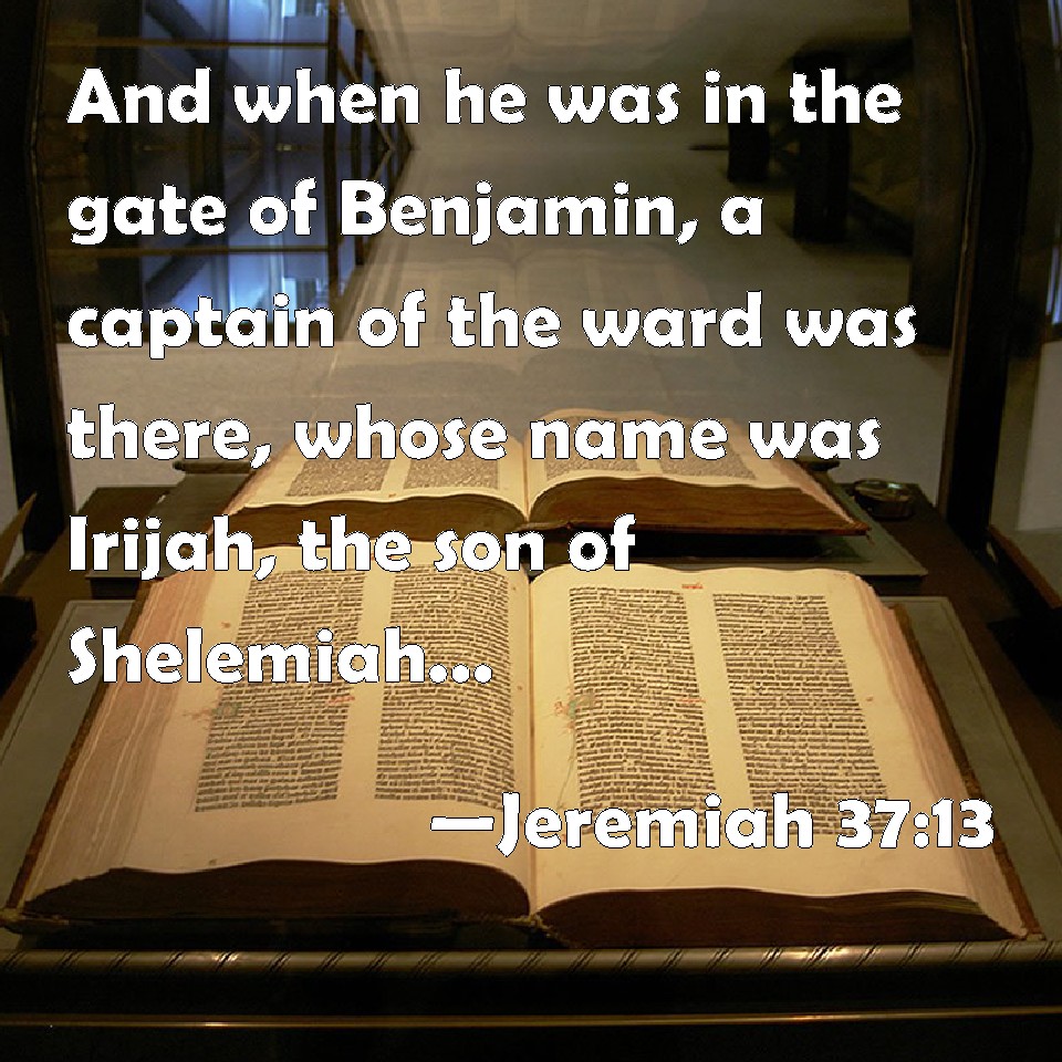 Choose a Background Jeremiah 37:13 And when he was in the gate of Benjamin, a captain of the ward was there, whose name was Irijah, the son of Shelemiah, the son of Hananiah; and he took Jeremiah the prophet, saying, You fall away to the Chaldeans. KJV: And when he was in the gate of Benjamin, a captain of the ward was there, whose name was Irijah, the son of Shelemiah, the son of Hananiah; and he took Jeremiah the prophet, saying, Thou fallest away to the Chaldeans. DRB: And when he was come to the gate of Benjamin, the captain of the gate, who I was there in his turn, was one named Jerias, the son of Selemias, the son of Hananias: and he took hold of Jeremias the prophet, saying: Thou art fleeing to the Chaldeans. DBT: And when he was in the gate of Benjamin, a captain of the guard was there whose name was Irijah, the son of Shelemiah, the son of Hananiah; and he laid hold on the prophet Jeremiah, saying, Thou art deserting to the Chaldeans. ERV: And when he was in the gate of Benjamin, a captain of the ward was there, whose name was Irijah, the son of Shelemiah, the son of Hananiah; and he laid hold on Jeremiah the prophet, saying, Thou fallest away to the Chaldeans. WBT: And when he was in the gate of Benjamin, a captain of the ward was there, whose name was Irijah, the son of Shelemiah, the son of Hananiah; and he took Jeremiah the prophet, saying, Thou fallest away to the Chaldeans. WEB: When he was in the gate of Benjamin, a captain of the guard was there, whose name was Irijah, the son of Shelemiah, the son of Hananiah; and he laid hold on Jeremiah the prophet, saying, You are falling away to the Chaldeans. YLT: And it cometh to pass, he is at the gate of Benjamin, and there is a master of the ward — and his name is Irijah son of Shelemiah, son of Hananiah — and he catcheth Jeremiah the prophet, saying, 'Unto the Chaldeans thou art falling.'Links Jeremiah 37:13 NIV • Jeremiah 37:13 NLT • Jeremiah 37:13 ESV • Jeremiah 37:13 NASB • Jeremiah 37:13 KJV • Jeremiah 37:13 Interlinear • Jeremiah 37:13 Commentaries • Jeremiah 37:13 Parallel Texts • Jeremiah 37:13 Bible Apps • Jeremiah 37:13 Parallel • Bible Hub |