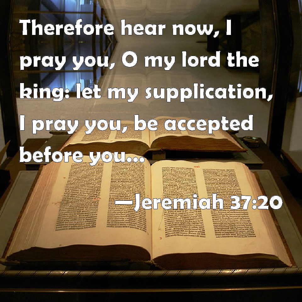 Choose a Background Jeremiah 37:20 Therefore hear now, I pray you, O my lord the king: let my supplication, I pray you, be accepted before you; that you cause me not to return to the house of Jonathan the scribe, lest I die there. KJV: Therefore hear now, I pray thee, O my lord the king: let my supplication, I pray thee, be accepted before thee; that thou cause me not to return to the house of Jonathan the scribe, lest I die there. DRB: Now therefore hear, I beseech thee, my lord the king: let my petition be accepted in thy sight: and send me not back into the house of Jonathan the scribe, lest I die there. DBT: And now hear, I pray thee, my lord, O king: let my supplication, I pray thee, come before thee; and cause me not to return into the house of Jonathan the scribe, lest I die there. ERV: And now hear, I pray thee, O my lord the king: let my supplication, I pray thee, be accepted before thee; that thou cause me not to return to the house of Jonathan the scribe, lest I die there. WBT: Therefore hear now, I pray thee, O my lord the king: let my supplication, I pray thee, be accepted before thee; that thou cause me not to return to the house of Jonathan the scribe, lest I die there. WEB: Now please hear, my lord the king: please let my supplication be presented before you, that you not cause me to return to the house of Jonathan the scribe, lest I die there. YLT: And now, hearken, I pray thee, my lord, O king, let my supplication fall, I pray thee, before thee, and cause me not to return to the house of Jonathan the scribe, that I die not there.'Links Jeremiah 37:20 NIV • Jeremiah 37:20 NLT • Jeremiah 37:20 ESV • Jeremiah 37:20 NASB • Jeremiah 37:20 KJV • Jeremiah 37:20 Interlinear • Jeremiah 37:20 Commentaries • Jeremiah 37:20 Parallel Texts • Jeremiah 37:20 Bible Apps • Jeremiah 37:20 Parallel • Bible Hub |