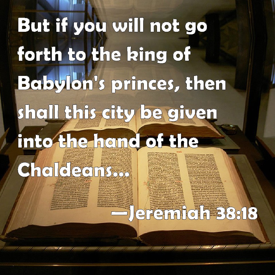 Choose a Background Jeremiah 38:18 But if you will not go forth to the king of Babylon's princes, then shall this city be given into the hand of the Chaldeans, and they shall burn it with fire, and you shall not escape out of their hand. KJV: But if thou wilt not go forth to the king of Babylon's princes, then shall this city be given into the hand of the Chaldeans, and they shall burn it with fire, and thou shalt not escape out of their hand. DRB: But if thou wilt not go out to the princes of the king of Babylon, this city shall be delivered into the hands of the Chaldeans, and they shall burn it with fire: and thou shalt not escape out of their hands. DBT: But if thou wilt not go forth to the king of Babylon's princes, then shall this city be given into the hand of the Chaldeans, and they shall burn it with fire, and thou shalt not escape out of their hand. ERV: But if thou wilt not go forth to the king of Babylon's princes, then shall this city be given into the hand of the Chaldeans, and they shall burn it with fire, and thou shalt not escape out of their hand. WBT: But if thou wilt not go forth to the king of Babylon's princes, then shall this city be given into the hand of the Chaldeans, and they shall burn it with fire, and thou shalt not escape from their hand. WEB: But if you will not go forth to the king of Babylon's princes, then shall this city be given into the hand of the Chaldeans, and they shall burn it with fire, and you shall not escape out of their hand. YLT: And if thou dost not go forth unto the heads of the king of Babylon, then hath this city been given into the hand of the Chaldeans, and they have burnt it with fire, and thou dost not escape from their hand.'Links Jeremiah 38:18 NIV • Jeremiah 38:18 NLT • Jeremiah 38:18 ESV • Jeremiah 38:18 NASB • Jeremiah 38:18 KJV • Jeremiah 38:18 Interlinear • Jeremiah 38:18 Commentaries • Jeremiah 38:18 Parallel Texts • Jeremiah 38:18 Bible Apps • Jeremiah 38:18 Parallel • Bible Hub |
