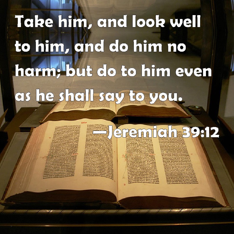 Choose a Background Jeremiah 39:12 Take him, and look well to him, and do him no harm; but do to him even as he shall say to you. KJV: Take him, and look well to him, and do him no harm; but do unto him even as he shall say unto thee. DRB: Take him, and set thy eyes upon him, and do him no harm: but as he hath a mind, so do with him. DBT: Take him, and keep an eye upon him, and do him no harm; but do unto him even as he shall say unto thee. ERV: Take him, and look well to him, and do him no harm; but do unto him even as he shall say unto thee. WBT: Take him, and look well to him, and do him no harm; but do to him even as he shall say to thee. WEB: Take him, and look well to him, and do him no harm; but do to him even as he shall tell you. YLT: 'Take him, and place thine eyes upon him, and do no evil thing to him, but as he speaketh unto thee, so do with him.'Links Jeremiah 39:12 NIV • Jeremiah 39:12 NLT • Jeremiah 39:12 ESV • Jeremiah 39:12 NASB • Jeremiah 39:12 KJV • Jeremiah 39:12 Interlinear • Jeremiah 39:12 Commentaries • Jeremiah 39:12 Parallel Texts • Jeremiah 39:12 Bible Apps • Jeremiah 39:12 Parallel • Bible Hub |