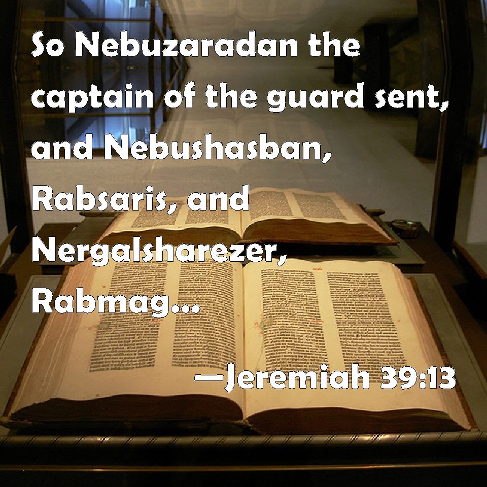 Choose a Background Jeremiah 39:13 So Nebuzaradan the captain of the guard sent, and Nebushasban, Rabsaris, and Nergalsharezer, Rabmag, and all the king of Babylon's princes; KJV: So Nebuzaradan the captain of the guard sent, and Nebushasban, Rabsaris, and Nergalsharezer, Rabmag, and all the king of Babylon's princes; DRB: Therefore Nabuzardan the general sent, and Nabusezban, and Rabsares, and Neregel, and Sereser, and Rebmag, and all the nobles of the king of Babylon, DBT: So Nebuzar-adan the captain of the body-guard sent, and Nebushazban, chief chamberlain, and Nergal-sharezer, chief magian, and all the king of Babylon's princes, ERV: So Nebuzaradan the captain of the guard sent, and Nebushazban, Rab-saris, and Nergal-sharezer, Rab-mag, and all the chief officers of the king of Babylon; WBT: So Nebuzar-adan the captain of the guard sent, and Nebushasban, Rab-saris, and Nergal-sharezer, Rab-mag, and all the king of Babylon's princes; WEB: So Nebuzaradan the captain of the guard sent, and Nebushazban, Rabsaris, and Nergal Sharezer, Rabmag, and all the chief officers of the king of Babylon; YLT: And Nebuzar-Adan, chief of the executioners sendeth, and Nebushazban, chief of the eunuchs, and Nergal-Sharezer, chief of the Mages, and all the chiefs of the king of Babylon;Links Jeremiah 39:13 NIV • Jeremiah 39:13 NLT • Jeremiah 39:13 ESV • Jeremiah 39:13 NASB • Jeremiah 39:13 KJV • Jeremiah 39:13 Interlinear • Jeremiah 39:13 Commentaries • Jeremiah 39:13 Parallel Texts • Jeremiah 39:13 Bible Apps • Jeremiah 39:13 Parallel • Bible Hub |