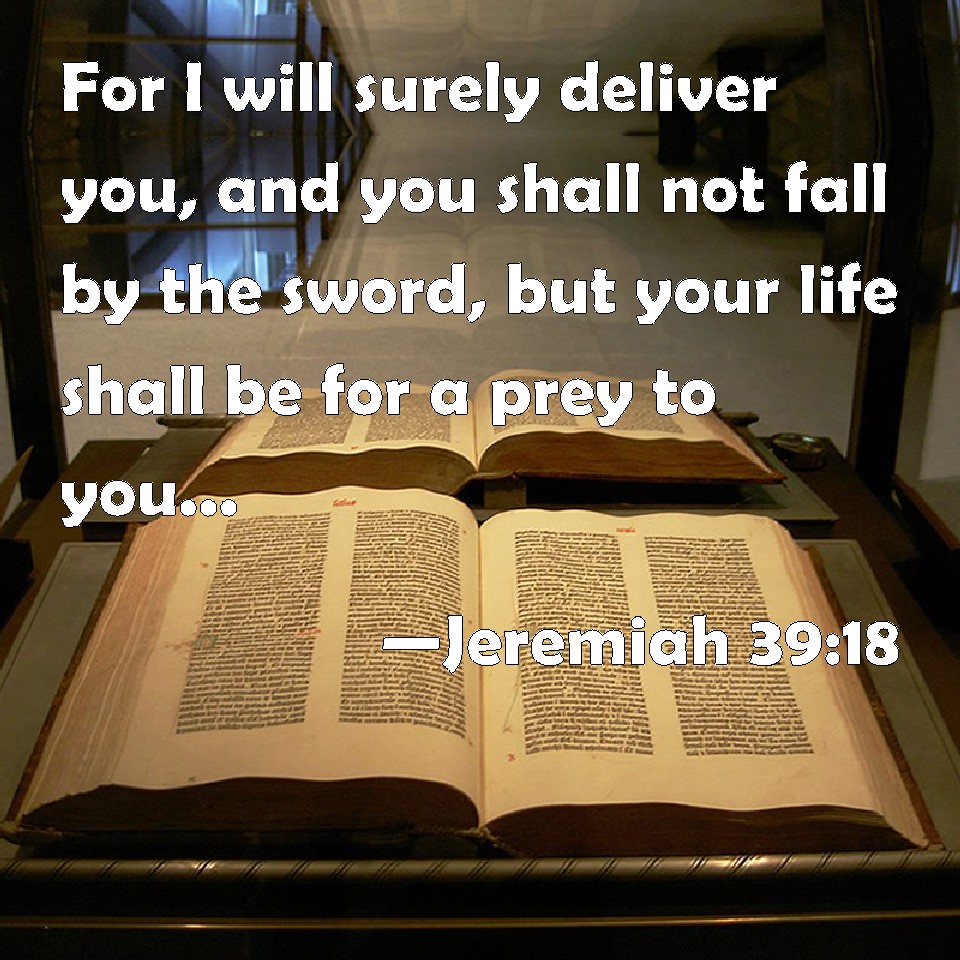 Choose a Background Jeremiah 39:18 For I will surely deliver you, and you shall not fall by the sword, but your life shall be for a prey to you: because you have put your trust in me, said the LORD. KJV: For I will surely deliver thee, and thou shalt not fall by the sword, but thy life shall be for a prey unto thee: because thou hast put thy trust in me, saith the LORD. DRB: But delivering, I will deliver thee, and thou shalt not fall by the sword : but thy life shall be saved for thee, because thou hast put thy trust in me, saith the Lord. DBT: for I will certainly save thee, and thou shalt not fall by the sword, but thou shalt have thy life for a prey; for thou hast put thy confidence in me, saith Jehovah. ERV: For I will surely save thee, and thou shalt not fall by the sword, but thy life shall be for a prey unto thee: because thou hast put thy trust in me, saith the LORD. WBT: For I will surely deliver thee, and thou shalt not fall by the sword, but thy life shall be for a prey to thee: because thou hast put thy trust in me, saith the LORD. WEB: For I will surely save you, and you shall not fall by the sword, but your life shall be for a prey to you; because you have put your trust in me, says Yahweh. YLT: for I do certainly deliver thee, and by sword thou fallest not, and thy life hath been to thee for a spoil, for thou hast trusted in Me — an affirmation of Jehovah.'Links Jeremiah 39:18 NIV • Jeremiah 39:18 NLT • Jeremiah 39:18 ESV • Jeremiah 39:18 NASB • Jeremiah 39:18 KJV • Jeremiah 39:18 Interlinear • Jeremiah 39:18 Commentaries • Jeremiah 39:18 Parallel Texts • Jeremiah 39:18 Bible Apps • Jeremiah 39:18 Parallel • Bible Hub |