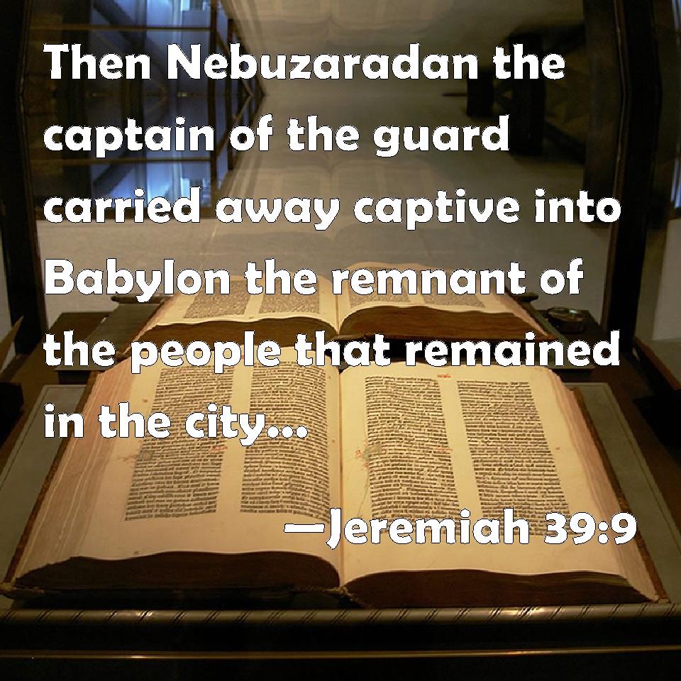 Choose a Background Jeremiah 39:9 Then Nebuzaradan the captain of the guard carried away captive into Babylon the remnant of the people that remained in the city, and those that fell away, that fell to him, with the rest of the people that remained. KJV: Then Nebuzaradan the captain of the guard carried away captive into Babylon the remnant of the people that remained in the city, and those that fell away, that fell to him, with the rest of the people that remained. DRB: And Nabuzardan the general of the army carried away captive to Babylon the remnant of the people that remained in the city, and the fugitives that had gone over to him, and the rest of the people that remained. DBT: And Nebuzar-adan the captain of the body-guard carried away captive into Babylon the rest of the people that were left in the city, and the deserters that had deserted to him, with the rest of the people that were left. ERV: Then Nebuzaradan the captain of the guard carried away captive into Babylon the residue of the people that remained in the city, the deserters also, that fell away to him, and the residue of the people that remained. WBT: Then Nebuzar-adan the captain of the guard carried away captive into Babylon the remnant of the people that remained in the city, and those that fell away, that fell to him, with the rest of the people that remained. WEB: Then Nebuzaradan the captain of the guard carried away captive into Babylon the residue of the people who remained in the city, the deserters also who fell away to him, and the residue of the people who remained. YLT: And the remnant of the people who are left in the city, and those falling who have fallen to him, and the remnant of the people who are left, hath Nebuzar-Adan, chief of the executioners, removed to Babylon.Links Jeremiah 39:9 NIV • Jeremiah 39:9 NLT • Jeremiah 39:9 ESV • Jeremiah 39:9 NASB • Jeremiah 39:9 KJV • Jeremiah 39:9 Interlinear • Jeremiah 39:9 Commentaries • Jeremiah 39:9 Parallel Texts • Jeremiah 39:9 Bible Apps • Jeremiah 39:9 Parallel • Bible Hub |