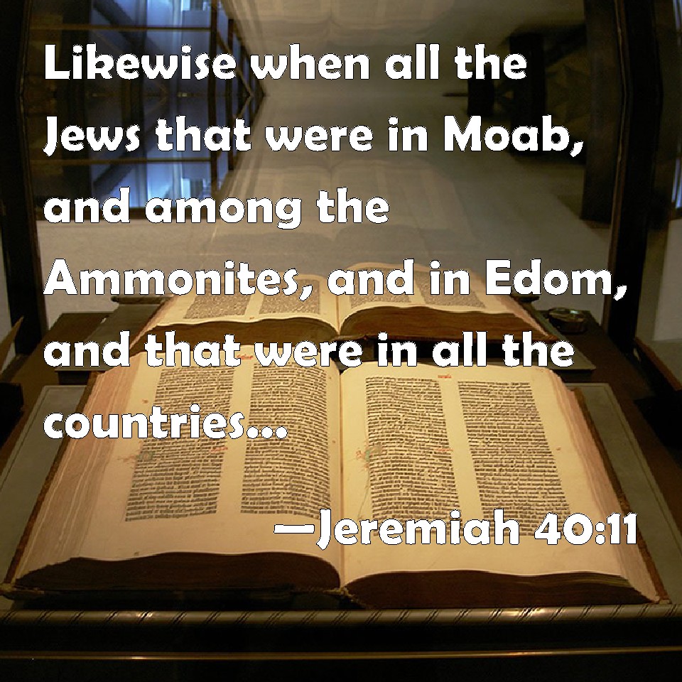 Choose a Background Jeremiah 40:11 Likewise when all the Jews that were in Moab, and among the Ammonites, and in Edom, and that were in all the countries, heard that the king of Babylon had left a remnant of Judah, and that he had set over them Gedaliah the son of Ahikam the son of Shaphan; KJV: Likewise when all the Jews that were in Moab, and among the Ammonites, and in Edom, and that were in all the countries, heard that the king of Babylon had left a remnant of Judah, and that he had set over them Gedaliah the son of Ahikam the son of Shaphan; DRB: Moreover all the Jews that were in Moab, and among the children of Ammon, and in Edom, and in all the countries, when they heard that the king of Babylon had left a remnant in Judea, and that he had made Godolias the son of Ahicam the son of Saphan ruler over them: DBT: Likewise all the Jews that were in Moab, and among the children of Ammon and in Edom, and that were in all the lands, heard that the king of Babylon had left a remnant in Judah, and that he had appointed over them Gedaliah the son of Ahikam the son of Shaphan; ERV: Likewise when all the Jews that were in Moab, and among the children of Ammon, and in Edom, and that were in all the countries, heard that the king of Babylon had left a remnant of Judah, and that he had set over them Gedaliah the son of Ahikam, the son of Shaphan; WBT: Likewise when all the Jews that were in Moab, and among the Ammonites, and in Edom, and that were in all the countries, heard that the king of Babylon had left a remnant of Judah, and that he had set over them Gedaliah the son of Ahikam the son of Shaphan; WEB: Likewise when all the Jews who were in Moab, and among the children of Ammon, and in Edom, and who were in all the countries, heard that the king of Babylon had left a remnant of Judah, and that he had set over them Gedaliah the son of Ahikam, the son of Shaphan; YLT: And also all the Jews who are in Moab, and among the sons of Ammon, and in Edom, and who are in all the lands, have heard that the king of Babylon hath given a remnant to Judah, and that he hath appointed over them Gedaliah son of Ahikam, son of Shaphan,Links Jeremiah 40:11 NIV • Jeremiah 40:11 NLT • Jeremiah 40:11 ESV • Jeremiah 40:11 NASB • Jeremiah 40:11 KJV • Jeremiah 40:11 Interlinear • Jeremiah 40:11 Commentaries • Jeremiah 40:11 Parallel Texts • Jeremiah 40:11 Bible Apps • Jeremiah 40:11 Parallel • Bible Hub |