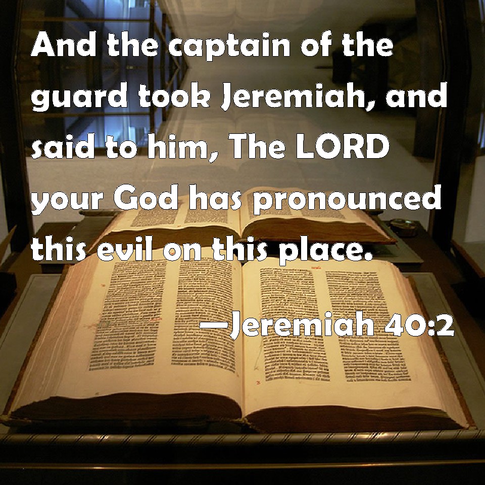 Choose a Background Jeremiah 40:2 And the captain of the guard took Jeremiah, and said to him, The LORD your God has pronounced this evil on this place. KJV: And the captain of the guard took Jeremiah, and said unto him, The LORD thy God hath pronounced this evil upon this place. DRB: And the general of the army taking Jeremias, said to him: The Lord thy God hath pronounced this evil upon this place, DBT: And the captain of the body-guard took Jeremiah, and said unto him, Jehovah thy God pronounced this evil upon this place, ERV: And the captain of the guard took Jeremiah, and said unto him, the LORD thy God pronounced this evil upon this place: WBT: And the captain of the guard took Jeremiah, and said to him, The LORD thy God hath pronounced this evil upon this place. WEB: The captain of the guard took Jeremiah, and said to him, Yahweh your God pronounced this evil on this place; YLT: And the chief of the executioners taketh Jeremiah, and saith unto him, 'Jehovah thy God hath spoken this evil concerning this place,Links Jeremiah 40:2 NIV • Jeremiah 40:2 NLT • Jeremiah 40:2 ESV • Jeremiah 40:2 NASB • Jeremiah 40:2 KJV • Jeremiah 40:2 Interlinear • Jeremiah 40:2 Commentaries • Jeremiah 40:2 Parallel Texts • Jeremiah 40:2 Bible Apps • Jeremiah 40:2 Parallel • Bible Hub |