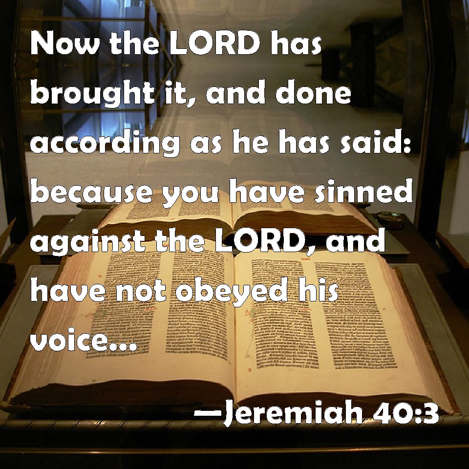 Choose a Background Jeremiah 40:3 Now the LORD has brought it, and done according as he has said: because you have sinned against the LORD, and have not obeyed his voice, therefore this thing is come on you. KJV: Now the LORD hath brought it, and done according as he hath said: because ye have sinned against the LORD, and have not obeyed his voice, therefore this thing is come upon you. DRB: And he hath brought it : and the Lord hath done as he hath said: because you have sinned against the Lord, and have not hearkened to his voice, and this word is come upon you. DBT: and Jehovah hath brought it about and done according as he said; for ye have sinned against Jehovah, and have not hearkened unto his voice, therefore this thing is come upon you. ERV: and the LORD hath brought it, and done according as he spake; because ye have sinned against the LORD, and have not obeyed his voice, therefore this thing is come upon you. WBT: Now the LORD hath brought it, and done according as he hath said: because ye have sinned against the LORD, and have not obeyed his voice, therefore this thing is come upon you. WEB: and Yahweh has brought it, and done according as he spoke: because you have sinned against Yahweh, and have not obeyed his voice, therefore this thing has come on you. YLT: and Jehovah bringeth it in, and doth as He spake, because ye have sinned against Jehovah, and have not hearkened to His voice, even this thing hath been to you.Links Jeremiah 40:3 NIV • Jeremiah 40:3 NLT • Jeremiah 40:3 ESV • Jeremiah 40:3 NASB • Jeremiah 40:3 KJV • Jeremiah 40:3 Interlinear • Jeremiah 40:3 Commentaries • Jeremiah 40:3 Parallel Texts • Jeremiah 40:3 Bible Apps • Jeremiah 40:3 Parallel • Bible Hub |