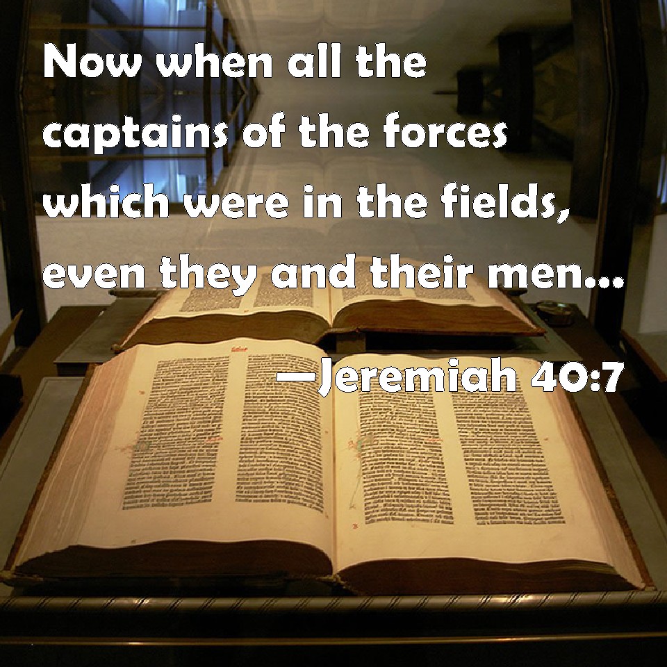 Choose a Background Jeremiah 40:7 Now when all the captains of the forces which were in the fields, even they and their men, heard that the king of Babylon had made Gedaliah the son of Ahikam governor in the land, and had committed to him men, and women, and children, and of the poor of the land, of them that were not carried away captive to Babylon; KJV: Now when all the captains of the forces which were in the fields, even they and their men, heard that the king of Babylon had made Gedaliah the son of Ahikam governor in the land, and had committed unto him men, and women, and children, and of the poor of the land, of them that were not carried away captive to Babylon; DRB: And when all the captains of the army that were scattered through the countries, they and their companions, had heard that the king of Babylon had made Godolias the son of Ahicam governor of the country, and that he had committed unto him men and women, and children, and of the poor of the land, them that had not been carried away captive to Babylon: DBT: And all the captains of the forces that were in the fields, they and their men, heard that the king of Babylon had appointed Gedaliah the son of Ahikam over the land, and had committed unto him men, and women, and children, and of the poor of the land, of them that had not been carried away captive to Babylon. ERV: Now when all the captains of the forces which were in the fields, even they and their men, heard that the king of Babylon had made Gedaliah the son of Ahikam governor in the land, and had committed unto him men, and women, and children, and of the poorest of the land, of them that were not carried away captive to Babylon; WBT: Now when all the captains of the forces who were in the fields, even they and their men, heard that the king of Babylon had made Gedaliah the son of Ahikam governor in the land, and had committed to him men, and women, and children, and of the poor of the land, of them that were not carried away captive to Babylon; WEB: Now when all the captains of the forces who were in the fields, even they and their men, heard that the king of Babylon had made Gedaliah the son of Ahikam governor in the land, and had committed to him men, and women, and children, and of the poorest of the land, of those who were not carried away captive to Babylon; YLT: And all the heads of the forces that are in the field hear, they and their men, that the king of Babylon hath appointed Gedaliah son of Ahikam over the land, and that he hath charged him with men, and women, and infants, and of the poor of the land, of those who have not been removed to Babylon;Links Jeremiah 40:7 NIV • Jeremiah 40:7 NLT • Jeremiah 40:7 ESV • Jeremiah 40:7 NASB • Jeremiah 40:7 KJV • Jeremiah 40:7 Interlinear • Jeremiah 40:7 Commentaries • Jeremiah 40:7 Parallel Texts • Jeremiah 40:7 Bible Apps • Jeremiah 40:7 Parallel • Bible Hub |