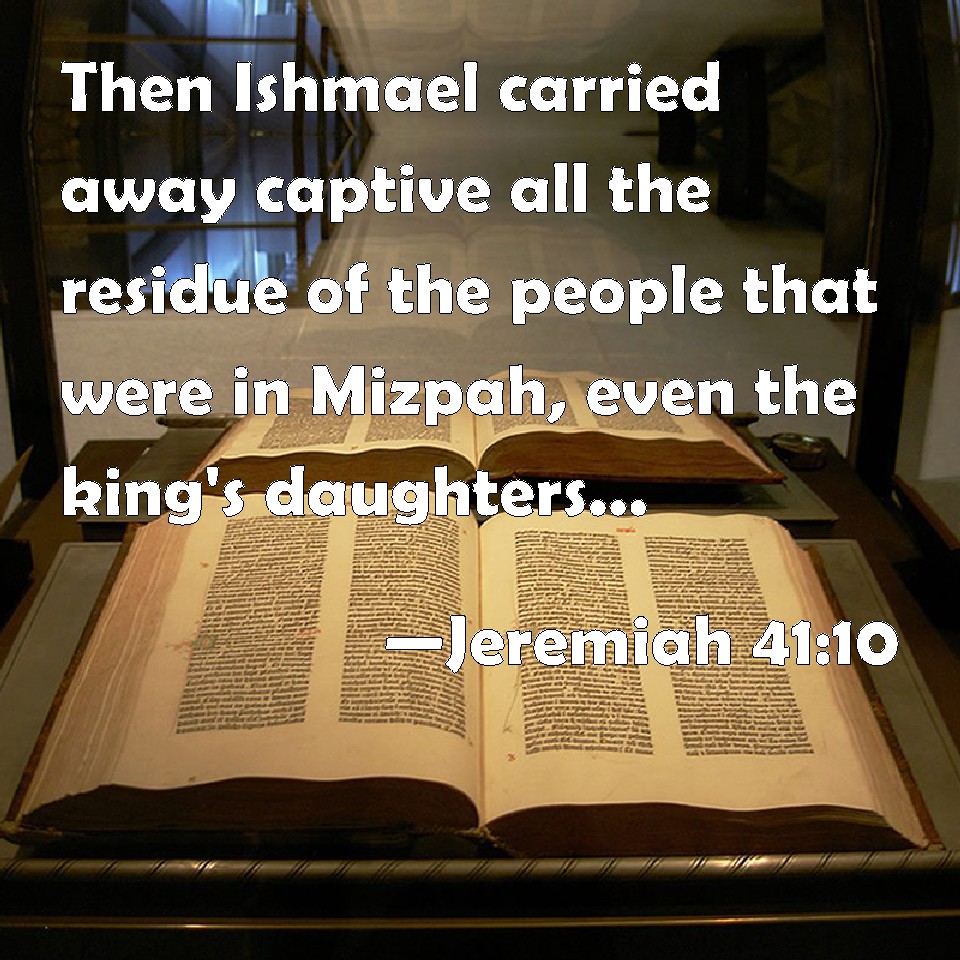 Jeremiah 41:10 Then Ishmael carried away captive all the residue of the people that were in Mizpah, even the king's daughters, and all the people that remained in Mizpah, whom Nebuzaradan the captain of the guard had committed to Gedaliah the son of Ahikam: and Ishmael the son of Nethaniah carried them away captive, and departed to go over to the Ammonites.