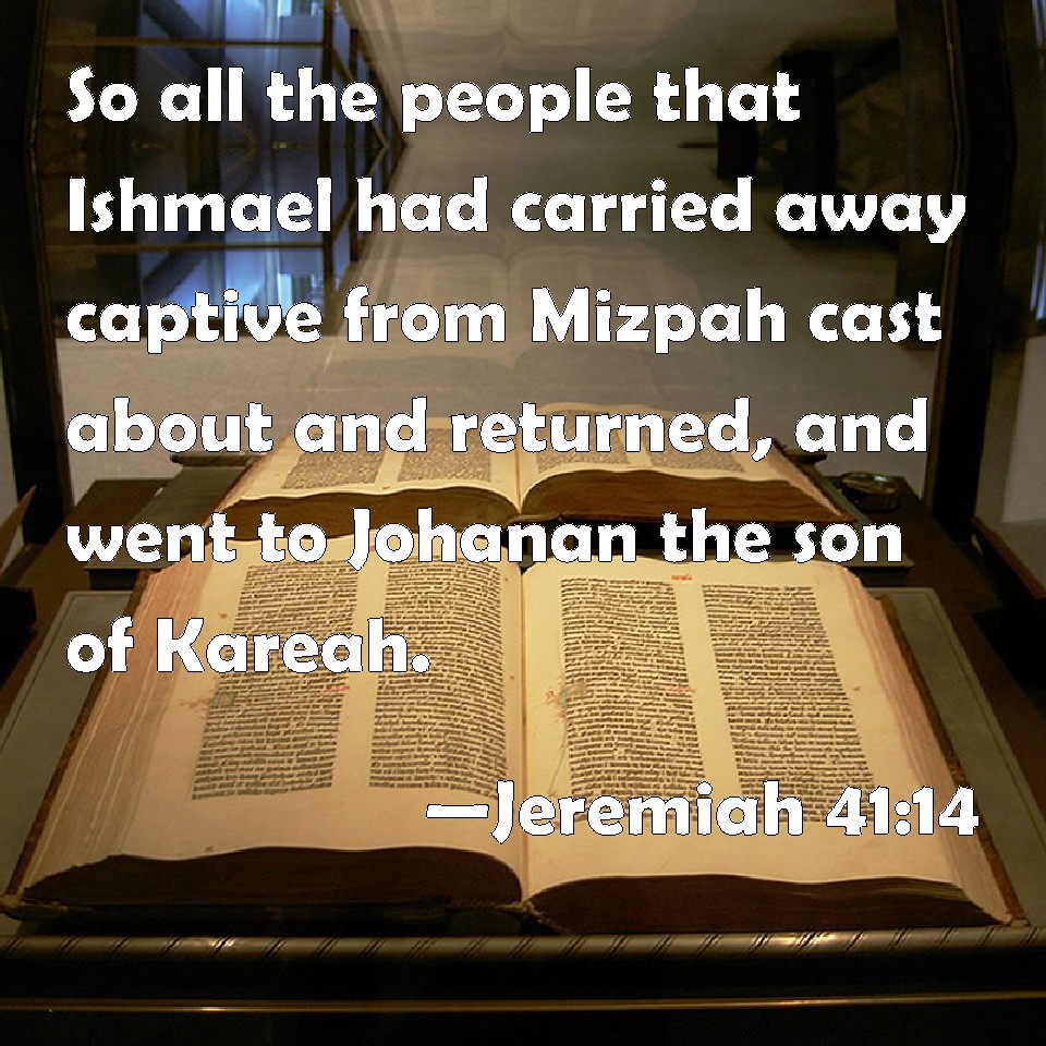Choose a Background Jeremiah 41:14 So all the people that Ishmael had carried away captive from Mizpah cast about and returned, and went to Johanan the son of Kareah. KJV: So all the people that Ishmael had carried away captive from Mizpah cast about and returned, and went unto Johanan the son of Kareah. DRB: And all the people whom Ismahel had taken, went back to Masphath: and they returned and went to Johanan the son of Caree. DBT: And all the people that Ishmael had carried away captive from Mizpah turned about and came back, and went to Johanan the son of Kareah. ERV: So all the people that Ishmael had carried away captive from Mizpah cast about and returned, and went unto Johanan the son of Kareah. WBT: So all the people that Ishmael had carried away captive from Mizpah cast about and returned, and went to Johanan the son of Kareah. WEB: So all the people who Ishmael had carried away captive from Mizpah turned about and came back, and went to Johanan the son of Kareah. YLT: And all the people whom Ishmael hath taken captive from Mizpah turn round, yea, they turn back, and go unto Johanan son of Kareah.Links Jeremiah 41:14 NIV • Jeremiah 41:14 NLT • Jeremiah 41:14 ESV • Jeremiah 41:14 NASB • Jeremiah 41:14 KJV • Jeremiah 41:14 Interlinear • Jeremiah 41:14 Commentaries • Jeremiah 41:14 Parallel Texts • Jeremiah 41:14 Bible Apps • Jeremiah 41:14 Parallel • Bible Hub |