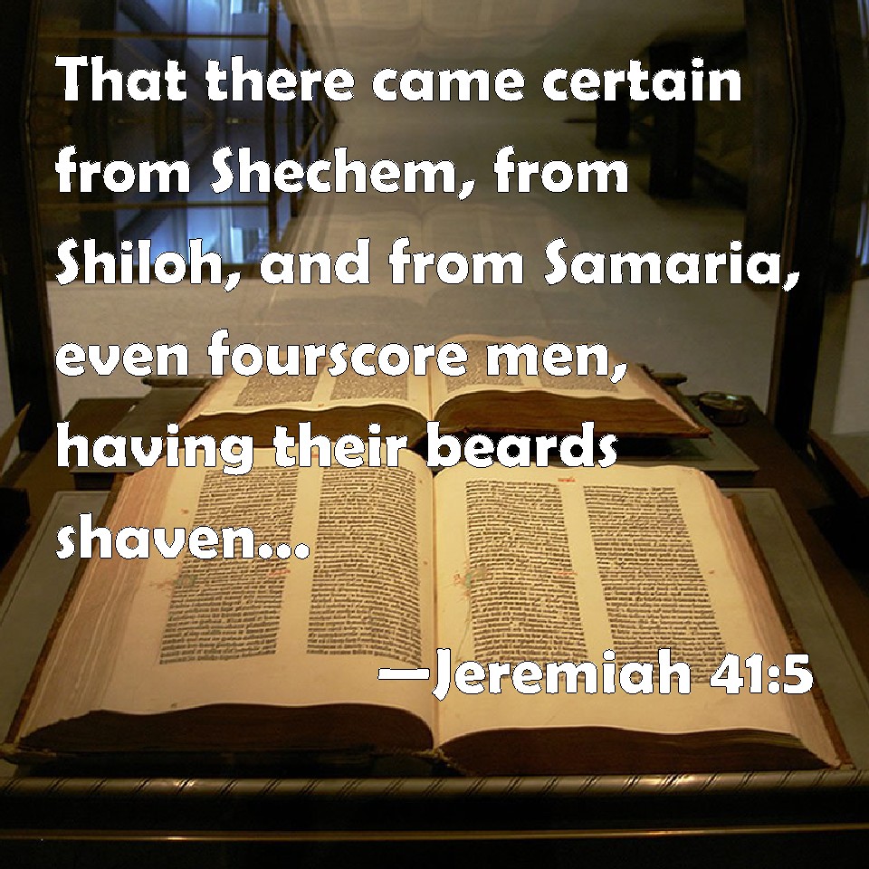 Choose a Background Jeremiah 41:5 That there came certain from Shechem, from Shiloh, and from Samaria, even fourscore men, having their beards shaven, and their clothes rent, and having cut themselves, with offerings and incense in their hand, to bring them to the house of the LORD. KJV: That there came certain from Shechem, from Shiloh, and from Samaria, even fourscore men, having their beards shaven, and their clothes rent, and having cut themselves, with offerings and incense in their hand, to bring them to the house of the LORD. DRB: There came some from Sichem, and from Silo, and from Samaria, fourscore men, with their beards shaven, and their clothes rent, and mourning: and they had offerings and incense in their hand, to offer in the house of the Lord. DBT: that there came men from Shechem, from Shiloh, and from Samaria, eighty men, having their beards shaven and their clothes rent, and having cut themselves; with oblations and incense in their hand, to bring them to the house of Jehovah. ERV: that there came certain from Shechem, from Shiloh, and from Samaria, even fourscore men, having their beards shaven and their clothes rent, and having cut themselves, with oblations and frankincense in their hand, to bring them to the house of the LORD. WBT: That there came men from Shechem, from Shiloh, and from Samaria, even eighty men, having their beards shaven, and their clothes rent, and having cut themselves, with offerings and incense in their hand, to bring them to the house of the LORD. WEB: that there came men from Shechem, from Shiloh, and from Samaria, even eighty men, having their beards shaved and their clothes torn, and having cut themselves, with meal offerings and frankincense in their hand, to bring them to the house of Yahweh. YLT: that men come in from Shechem, from Shiloh, and from Samaria — eighty men — with shaven beards, and rent garments, and cutting themselves, and an offering and frankincense in their hand, to bring in to the house of Jehovah.Links Jeremiah 41:5 NIV • Jeremiah 41:5 NLT • Jeremiah 41:5 ESV • Jeremiah 41:5 NASB • Jeremiah 41:5 KJV • Jeremiah 41:5 Interlinear • Jeremiah 41:5 Commentaries • Jeremiah 41:5 Parallel Texts • Jeremiah 41:5 Bible Apps • Jeremiah 41:5 Parallel • Bible Hub |
