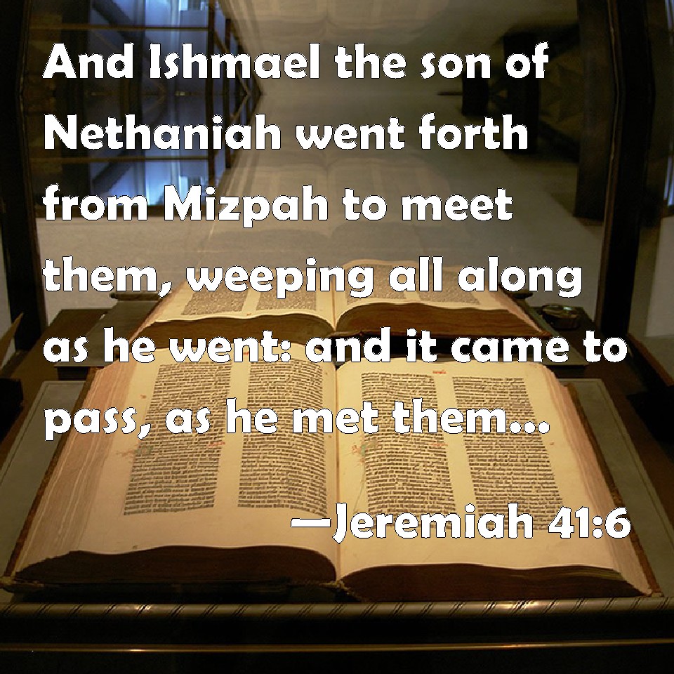 Choose a Background Jeremiah 41:6 And Ishmael the son of Nethaniah went forth from Mizpah to meet them, weeping all along as he went: and it came to pass, as he met them, he said to them, Come to Gedaliah the son of Ahikam. KJV: And Ishmael the son of Nethaniah went forth from Mizpah to meet them, weeping all along as he went: and it came to pass, as he met them, he said unto them, Come to Gedaliah the son of Ahikam. DRB: And Ismahel the son of Nathanias went forth from Masphath to meet them, weeping all along as he went: and when he had met them, he said to them: Come to Godolias, the son of Ahicam. DBT: And Ishmael the son of Nethaniah went forth from Mizpah to meet them, weeping all along as he went; and it came to pass when he met them, he said unto them, Come to Gedaliah the son of Ahikam. ERV: And Ishmael the son of Nethaniah went forth from Mizpah to meet them, weeping all along as he went: and it came to pass, as he met them, he said unto them, Come to Gedaliah the son of Ahikam. WBT: And Ishmael the son of Nethaniah went forth from Mizpah to meet them, weeping all along as he went: and it came to pass, as he met them, he said to them, Come to Gedaliah the son of Ahikam. WEB: Ishmael the son of Nethaniah went forth from Mizpah to meet them, weeping all along as he went: and it happened, as he met them, he said to them, Come to Gedaliah the son of Ahikam. YLT: And Ishmael son of Nethaniah goeth forth to meet them, from Mizpah, going on and weeping, and it cometh to pass, at meeting them, that he saith unto them, 'Come in unto Gedaliah son of Ahikam.'Links Jeremiah 41:6 NIV • Jeremiah 41:6 NLT • Jeremiah 41:6 ESV • Jeremiah 41:6 NASB • Jeremiah 41:6 KJV • Jeremiah 41:6 Interlinear • Jeremiah 41:6 Commentaries • Jeremiah 41:6 Parallel Texts • Jeremiah 41:6 Bible Apps • Jeremiah 41:6 Parallel • Bible Hub |