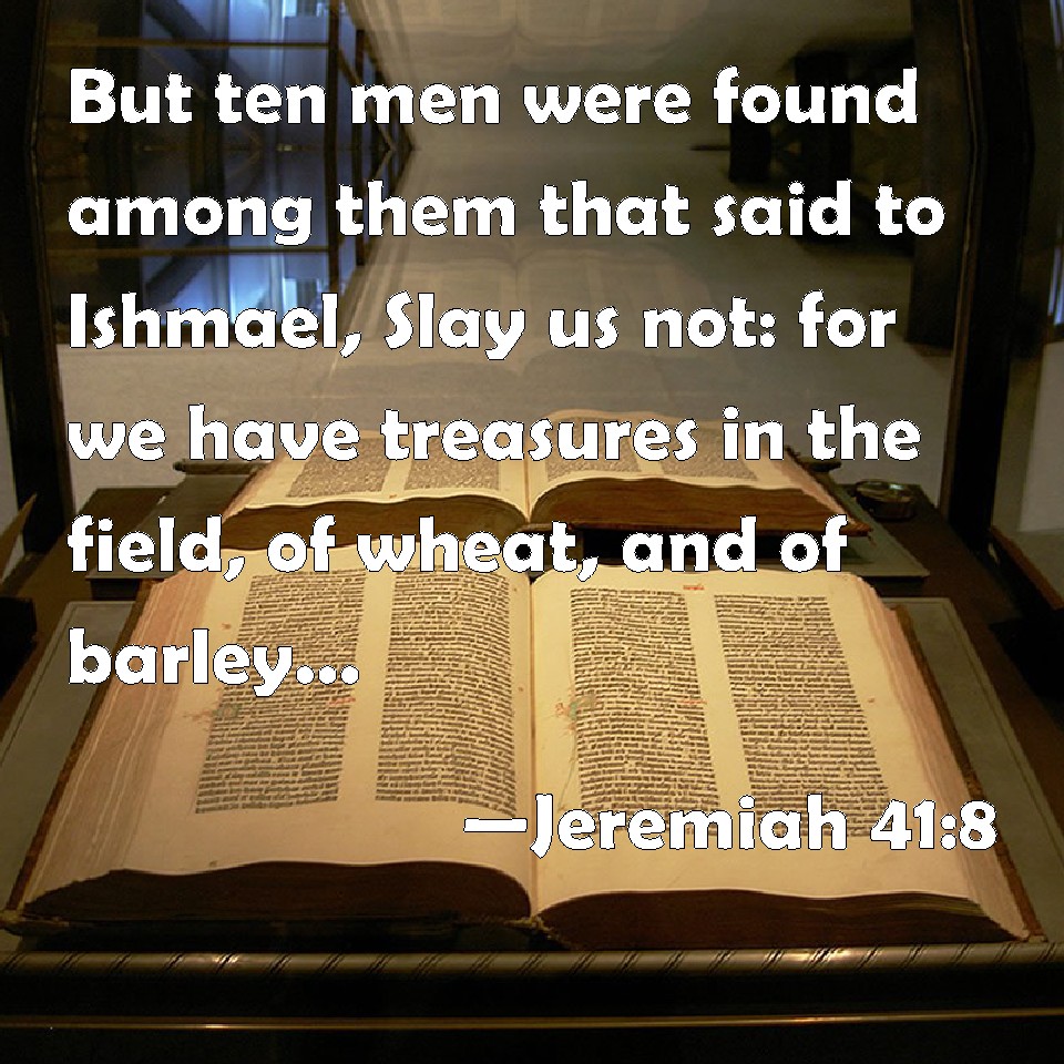 Choose a Background Jeremiah 41:8 But ten men were found among them that said to Ishmael, Slay us not: for we have treasures in the field, of wheat, and of barley, and of oil, and of honey. So he declined, and slew them not among their brothers. KJV: But ten men were found among them that said unto Ishmael, Slay us not: for we have treasures in the field, of wheat, and of barley, and of oil, and of honey. So he forbare, and slew them not among their brethren. DRB: But ten men were found among them, that said to Ismahel : Kill us not: for we have stores in the field, of wheat, and barley, and oil, and honey. And he forbore, and slew them not with their brethren. DBT: But ten men were found among them that said unto Ishmael, Do not kill us, for we have hidden stores in the field, of wheat, and of barley, and of oil, and of honey. So he forbore, and did not kill them among their brethren. ERV: But ten men were found among them that said unto Ishmael, Slay us not: for we have stores hidden in the field, of wheat, and of barley, and of oil, and of honey. So he forbare, and slew them not among their brethren. WBT: But ten men were found among them that said to Ishmael, Slay us not: for we have treasures in the field, of wheat, and of barley, and of oil, and of honey. So he forbore, and slew them not among their brethren. WEB: But ten men were found among those who said to Ishmael, Don't kill us; for we have stores hidden in the field, of wheat, and of barley, and of oil, and of honey. So he stopped, and didn't kill them among their brothers. YLT: And ten men have been found among them, and they say unto Ishmael, 'Do not put us to death, for we have things hidden in the field — wheat, and barley, and oil, and honey.' And he forbeareth, and hath not put them to death in the midst of their brethren.Links Jeremiah 41:8 NIV • Jeremiah 41:8 NLT • Jeremiah 41:8 ESV • Jeremiah 41:8 NASB • Jeremiah 41:8 KJV • Jeremiah 41:8 Interlinear • Jeremiah 41:8 Commentaries • Jeremiah 41:8 Parallel Texts • Jeremiah 41:8 Bible Apps • Jeremiah 41:8 Parallel • Bible Hub |