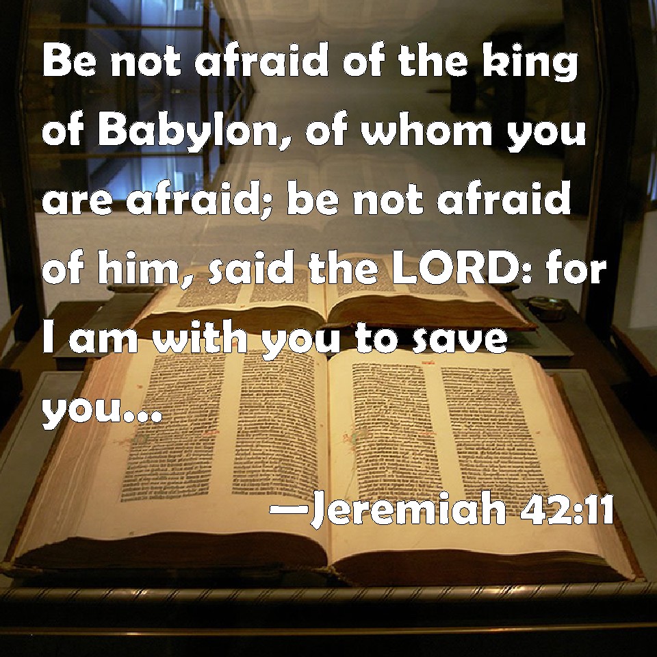 Choose a Background Jeremiah 42:11 Be not afraid of the king of Babylon, of whom you are afraid; be not afraid of him, said the LORD: for I am with you to save you, and to deliver you from his hand. KJV: Be not afraid of the king of Babylon, of whom ye are afraid; be not afraid of him, saith the LORD: for I am with you to save you, and to deliver you from his hand. DRB: Fear not because of the king of Babylon, of whom you are greatly afraid: fear him not, saith the Lord: for I am with you, to save you, and to deliver you from his hand. DBT: Be not afraid of the king of Babylon, of whom ye are afraid: be not afraid of him, saith Jehovah; for I will be with you to save you, and to deliver you from his hand. ERV: Be not afraid of the king of Babylon, of whom ye are afraid; be not afraid of him, saith the LORD: for I am with you to save you, and to deliver you from his hand. WBT: Be not afraid of the king of Babylon, of whom ye are afraid; be not afraid of him, saith the LORD; for I am with you, to save you, and to deliver you from his hand. WEB: Don't be afraid of the king of Babylon, of whom you are afraid; don't be afraid of him, says Yahweh: for I am with you to save you, and to deliver you from his hand. YLT: Be not afraid of the king of Babylon, whom ye are afraid of; be not afraid of him — an affirmation of Jehovah — for with you am I, to save you, and to deliver you from his hand.Links Jeremiah 42:11 NIV • Jeremiah 42:11 NLT • Jeremiah 42:11 ESV • Jeremiah 42:11 NASB • Jeremiah 42:11 KJV • Jeremiah 42:11 Interlinear • Jeremiah 42:11 Commentaries • Jeremiah 42:11 Parallel Texts • Jeremiah 42:11 Bible Apps • Jeremiah 42:11 Parallel • Bible Hub |