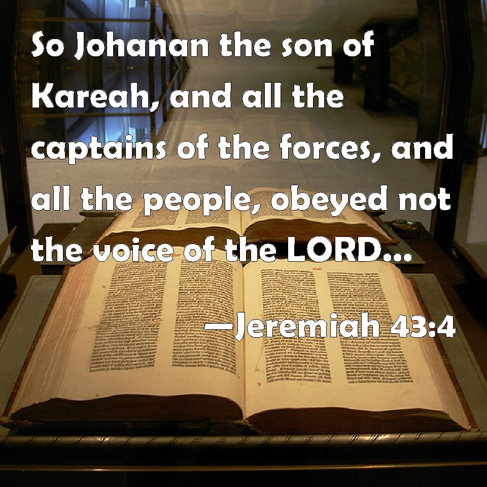 Choose a Background Jeremiah 43:4 So Johanan the son of Kareah, and all the captains of the forces, and all the people, obeyed not the voice of the LORD, to dwell in the land of Judah. KJV: So Johanan the son of Kareah, and all the captains of the forces, and all the people, obeyed not the voice of the LORD, to dwell in the land of Judah. DRB: So Johanan the son of Caree, and all the captains of the soldiers, and all the people, obeyed not the voice of the Lord, to remain in the land of Juda. DBT: So Johanan the son of Kareah, and all the captains of the forces, and all the people, hearkened not unto the voice of Jehovah to abide in the land of Judah; ERV: So Johanan the son of Kareah, and all the captains of the forces, and all the people, obeyed not the voice of the LORD, to dwell in the land of Judah. WBT: So Johanan the son of Kareah, and all the captains of the forces, and all the people, obeyed not the voice of the LORD, to dwell in the land of Judah. WEB: So Johanan the son of Kareah, and all the captains of the forces, and all the people, didn't obey the voice of Yahweh, to dwell in the land of Judah. YLT: And Johanan son of Kareah, and all the heads of the forces, and all the people, have not hearkened to the voice of Jehovah, to dwell in the land of Judah;Links Jeremiah 43:4 NIV • Jeremiah 43:4 NLT • Jeremiah 43:4 ESV • Jeremiah 43:4 NASB • Jeremiah 43:4 KJV • Jeremiah 43:4 Interlinear • Jeremiah 43:4 Commentaries • Jeremiah 43:4 Parallel Texts • Jeremiah 43:4 Bible Apps • Jeremiah 43:4 Parallel • Bible Hub |