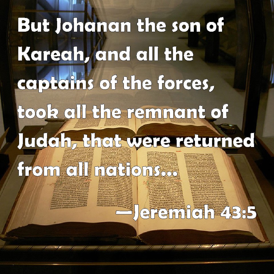 Choose a Background Jeremiah 43:5 But Johanan the son of Kareah, and all the captains of the forces, took all the remnant of Judah, that were returned from all nations, where they had been driven, to dwell in the land of Judah; KJV: But Johanan the son of Kareah, and all the captains of the forces, took all the remnant of Judah, that were returned from all nations, whither they had been driven, to dwell in the land of Judah; DRB: But Johanan the son of Caree, and all the captains of the soldiers took all the remnant of Juda, that were returned out of all nations, to which they had before been scattered, to dwell in the land of Juda: DBT: but Johanan the son of Kareah, and all the captains of the forces, took all the remnant of Judah, that were returned from all nations whither they had been driven, to sojourn in the land of Judah; ERV: But Johanan the son of Kareah, and all the captains of the forces, took all the remnant of Judah, that were returned from all the nations whither they had been driven to sojourn in the land of Judah; WBT: But Johanan the son of Kareah, and all the captains of the forces, took all the remnant of Judah, that had returned from all nations, whither they had been driven, to dwell in the land of Judah; WEB: But Johanan the son of Kareah, and all the captains of the forces, took all the remnant of Judah, who were returned from all the nations where they had been driven, to live in the land of Judah; YLT: and Johanan son of Kareah, and all the heads of the forces, take all the remnant of Judah who have turned from all the nations whither they were driven to sojourn in the land of Judah,Links Jeremiah 43:5 NIV • Jeremiah 43:5 NLT • Jeremiah 43:5 ESV • Jeremiah 43:5 NASB • Jeremiah 43:5 KJV • Jeremiah 43:5 Interlinear • Jeremiah 43:5 Commentaries • Jeremiah 43:5 Parallel Texts • Jeremiah 43:5 Bible Apps • Jeremiah 43:5 Parallel • Bible Hub |