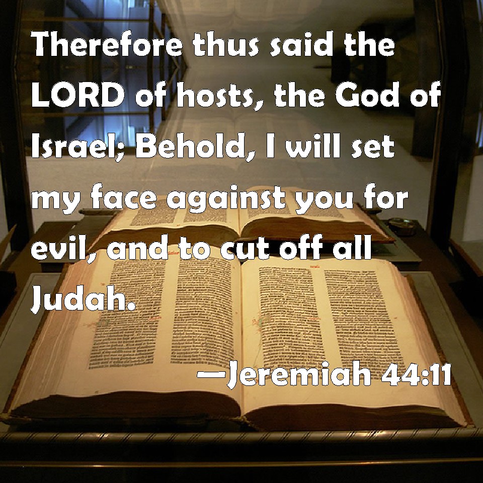 Choose a Background Jeremiah 44:11 Therefore thus said the LORD of hosts, the God of Israel; Behold, I will set my face against you for evil, and to cut off all Judah. KJV: Therefore thus saith the LORD of hosts, the God of Israel; Behold, I will set my face against you for evil, and to cut off all Judah. DRB: Therefore thus saith the Lord of hosts the God of Israel: Behold I will set my face upon you for evil: and I will destroy all Juda. DBT: Therefore thus saith Jehovah of hosts, the God of Israel: Behold, I will set my face against you for evil, and to cut off all Judah. ERV: Therefore thus saith the LORD of hosts, the God of Israel: Behold, I will set my face against you for evil, even to cut off all Judah. WBT: Therefore thus saith the LORD of hosts, the God of Israel; Behold, I will set my face against you for evil, and to cut off all Judah. WEB: Therefore thus says Yahweh of Armies, the God of Israel: Behold, I will set my face against you for evil, even to cut off all Judah. YLT: 'Therefore, thus said Jehovah of Hosts, God of Israel: Lo, I am setting my face against you for evil, even to cut off all Judah,Links Jeremiah 44:11 NIV • Jeremiah 44:11 NLT • Jeremiah 44:11 ESV • Jeremiah 44:11 NASB • Jeremiah 44:11 KJV • Jeremiah 44:11 Interlinear • Jeremiah 44:11 Commentaries • Jeremiah 44:11 Parallel Texts • Jeremiah 44:11 Bible Apps • Jeremiah 44:11 Parallel • Bible Hub |