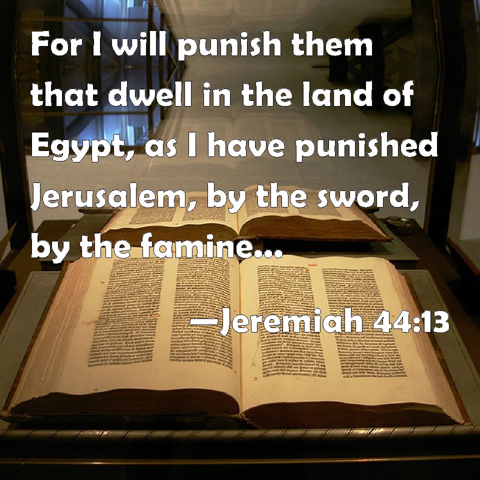 Choose a Background Jeremiah 44:13 For I will punish them that dwell in the land of Egypt, as I have punished Jerusalem, by the sword, by the famine, and by the pestilence: KJV: For I will punish them that dwell in the land of Egypt, as I have punished Jerusalem, by the sword, by the famine, and by the pestilence: DRB: And I will visit them that dwell in the land of Egypt, as I have visited Jerusalem by the sword, and by famine, and by pestilence. DBT: And I will punish them that dwell in the land of Egypt as I have punished Jerusalem, by the sword, by the famine, and by the pestilence; ERV: For I will punish them that dwell in the land of Egypt, as I have punished Jerusalem, by the sword, by the famine, and by the pestilence: WBT: For I will punish them that dwell in the land of Egypt, as I have punished Jerusalem, by the sword, by the famine, and by the pestilence: WEB: For I will punish those who dwell in the land of Egypt, as I have punished Jerusalem, by the sword, by the famine, and by the pestilence; YLT: 'And I have seen after those dwelling in the land of Egypt, as I saw after Jerusalem, with sword, with famine, and with pestilence,Links Jeremiah 44:13 NIV • Jeremiah 44:13 NLT • Jeremiah 44:13 ESV • Jeremiah 44:13 NASB • Jeremiah 44:13 KJV • Jeremiah 44:13 Interlinear • Jeremiah 44:13 Commentaries • Jeremiah 44:13 Parallel Texts • Jeremiah 44:13 Bible Apps • Jeremiah 44:13 Parallel • Bible Hub |
