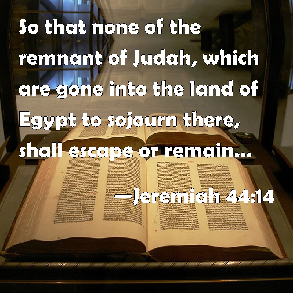 Choose a Background Jeremiah 44:14 So that none of the remnant of Judah, which are gone into the land of Egypt to sojourn there, shall escape or remain, that they should return into the land of Judah, to the which they have a desire to return to dwell there: for none shall return but such as shall escape. KJV: So that none of the remnant of Judah, which are gone into the land of Egypt to sojourn there, shall escape or remain, that they should return into the land of Judah, to the which they have a desire to return to dwell there: for none shall return but such as shall escape. DRB: And there shall be none that shall escape, and remain of the remnant of the Jews that are gone to sojourn in the land of Egypt: and that shall return into the land of Juda, to which they have a desire to return to dwell there: there shall none return but they that shall flee. DBT: and none of the remnant of Judah, that have come into the land of Egypt to sojourn there, shall escape or remain, so as to return into the land of Judah, whither they have a desire to return to dwell there; for none shall return but such as shall escape. ERV: so that none of the remnant of Judah, which are gone into the land of Egypt to sojourn there, shall escape or remain, that they should return into the land of Judah, to the which they have a desire to return to dwell there: for none shall return save such as shall escape. WBT: So that none of the remnant of Judah, who have gone into the land of Egypt, to sojourn there, shall escape or remain, that they should return into the land of Judah, to which they have a desire to return to dwell there: for none shall return but such as shall escape. WEB: so that none of the remnant of Judah, who have gone into the land of Egypt to live there, shall escape or be left, to return into the land of Judah, to which they have a desire to return to dwell there: for none shall return save such as shall escape. YLT: and there is not an escaped and remaining one of the remnant of Judah, who are entering into the land of Egypt to sojourn there, even to turn back to the land of Judah, whither they are lifting up their soul to return to dwell, for they do not turn back, except those escaping.'Links Jeremiah 44:14 NIV • Jeremiah 44:14 NLT • Jeremiah 44:14 ESV • Jeremiah 44:14 NASB • Jeremiah 44:14 KJV • Jeremiah 44:14 Interlinear • Jeremiah 44:14 Commentaries • Jeremiah 44:14 Parallel Texts • Jeremiah 44:14 Bible Apps • Jeremiah 44:14 Parallel • Bible Hub |