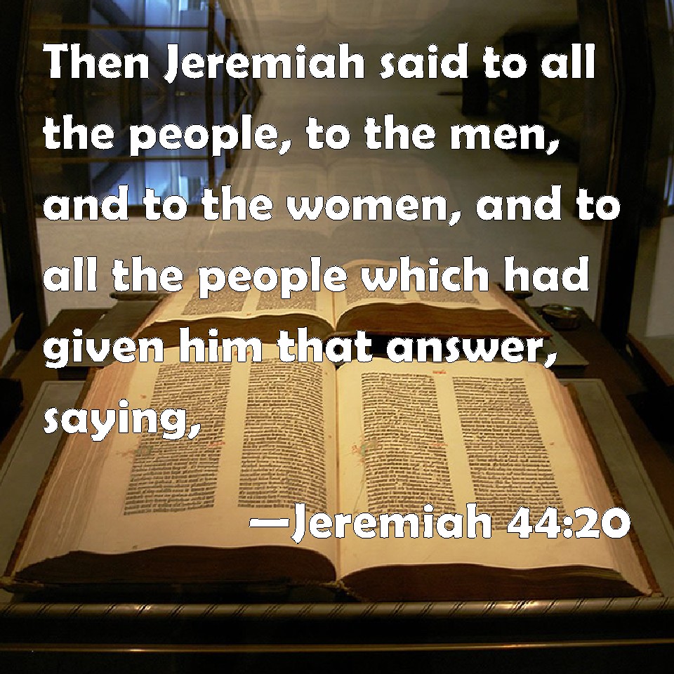 Choose a Background Jeremiah 44:20 Then Jeremiah said to all the people, to the men, and to the women, and to all the people which had given him that answer, saying, KJV: Then Jeremiah said unto all the people, to the men, and to the women, and to all the people which had given him that answer, saying, DRB: And Jeremias spoke to all the people, to the men, and to the women, and to all the people which had given him that answer, saying: DBT: And Jeremiah said unto all the people, to the men, and to the women, and to all the people that had given him that answer, saying, ERV: Then Jeremiah said unto all the people, to the men, and to the women, even to all the people which had given him that answer, saying, WBT: Then Jeremiah said to all the people, to the men, and to the women, and to all the people who had given him that answer, saying, WEB: Then Jeremiah said to all the people, to the men, and to the women, even to all the people who had given him an answer, saying, YLT: And Jeremiah saith unto all the people, concerning the men and concerning the women, and concerning all the people who are answering him, saying:Links Jeremiah 44:20 NIV • Jeremiah 44:20 NLT • Jeremiah 44:20 ESV • Jeremiah 44:20 NASB • Jeremiah 44:20 KJV • Jeremiah 44:20 Interlinear • Jeremiah 44:20 Commentaries • Jeremiah 44:20 Parallel Texts • Jeremiah 44:20 Bible Apps • Jeremiah 44:20 Parallel • Bible Hub |
