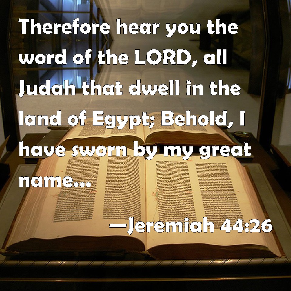 Choose a Background Jeremiah 44:26 Therefore hear you the word of the LORD, all Judah that dwell in the land of Egypt; Behold, I have sworn by my great name, said the LORD, that my name shall no more be named in the mouth of any man of Judah in all the land of Egypt, saying, The Lord GOD lives. KJV: Therefore hear ye the word of the LORD, all Judah that dwell in the land of Egypt; Behold, I have sworn by my great name, saith the LORD, that my name shall no more be named in the mouth of any man of Judah in all the land of Egypt, saying, The Lord GOD liveth. DRB: Therefore hear ye the word of the Lord, all Juda, you that dwell in the land of Egypt: Behold I have sworn by my great name, saith the Lord: that my name shall no more be named in the mouth of any man of Juda, in the land of Egypt, saying: The Lord God liveth. DBT: Therefore hear ye the word of Jehovah, all Judah that dwell in the land of Egypt: Behold, I have sworn by my great name, saith Jehovah, that my name shall no more be named in the mouth of any man of Judah in all the land of Egypt, saying, As the Lord Jehovah liveth. ERV: Therefore hear ye the word of the LORD, all Judah that dwell in the land of Egypt: Behold, I have sworn by my great name, saith the LORD, that my name shall no more be named in the mouth of any man of Judah in all the land of Egypt, saying, As the Lord GOD liveth. WBT: Therefore hear ye the word of the LORD, all Judah that dwell in the land of Egypt; Behold, I have sworn by my great name, saith the LORD, that my name shall no more be named in the mouth of any man of Judah in all the land of Egypt, saying, The Lord GOD liveth. WEB: Therefore hear the word of Yahweh, all Judah who dwell in the land of Egypt: Behold, I have sworn by my great name, says Yahweh, that my name shall no more be named in the mouth of any man of Judah in all the land of Egypt, saying, As the Lord Yahweh lives. YLT: Therefore, hear ye a word of Jehovah, all Judah who are dwelling in the land of Egypt: Lo, I — I have sworn by My great name, said Jehovah, My name is no more proclaimed by the mouth of any man of Judah, saying, Live doth the Lord Jehovah — in all the land of Egypt.Links Jeremiah 44:26 NIV • Jeremiah 44:26 NLT • Jeremiah 44:26 ESV • Jeremiah 44:26 NASB • Jeremiah 44:26 KJV • Jeremiah 44:26 Interlinear • Jeremiah 44:26 Commentaries • Jeremiah 44:26 Parallel Texts • Jeremiah 44:26 Bible Apps • Jeremiah 44:26 Parallel • Bible Hub |