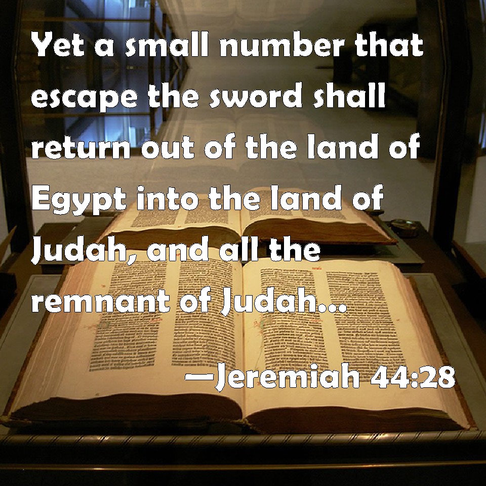 Choose a Background Jeremiah 44:28 Yet a small number that escape the sword shall return out of the land of Egypt into the land of Judah, and all the remnant of Judah, that are gone into the land of Egypt to sojourn there, shall know whose words shall stand, mine, or theirs. KJV: Yet a small number that escape the sword shall return out of the land of Egypt into the land of Judah, and all the remnant of Judah, that are gone into the land of Egypt to sojourn there, shall know whose words shall stand, mine, or theirs. DRB: And a few men that shall flee from the sword, shall return out of the land of Egypt into the land of Juda: and all the remnant of Juda that are gone into the land of Egypt to dwell there, shall know whose word shall stand, mine, or theirs. DBT: And they that escape the sword shall return out of the land of Egypt into the land of Judah, a very small company; and all the remnant of Judah, that have come into the land of Egypt to sojourn there, shall know whose word shall stand, mine or theirs. ERV: And they that escape the sword shall return out of the land of Egypt into the land of Judah, few in number; and all the remnant of Judah, that are gone into the land of Egypt to sojourn there, shall know whose word shall stand, mine, or theirs. WBT: Yet a small number that escape the sword shall return from the land of Egypt into the land of Judah, and all the remnant of Judah, that have gone into the land of Egypt to sojourn there, shall know whose words shall stand, mine, or theirs. WEB: Those who escape the sword shall return out of the land of Egypt into the land of Judah, few in number; and all the remnant of Judah, who have gone into the land of Egypt to live there, shall know whose word shall stand, mine, or theirs. YLT: 'And the escaped of the sword turn back out of the land of Egypt to the land of Judah, few in number, and known have all the remnant of Judah who are coming into the land of Egypt to sojourn there, whose word is established, Mine or theirs.Links Jeremiah 44:28 NIV • Jeremiah 44:28 NLT • Jeremiah 44:28 ESV • Jeremiah 44:28 NASB • Jeremiah 44:28 KJV • Jeremiah 44:28 Interlinear • Jeremiah 44:28 Commentaries • Jeremiah 44:28 Parallel Texts • Jeremiah 44:28 Bible Apps • Jeremiah 44:28 Parallel • Bible Hub |
