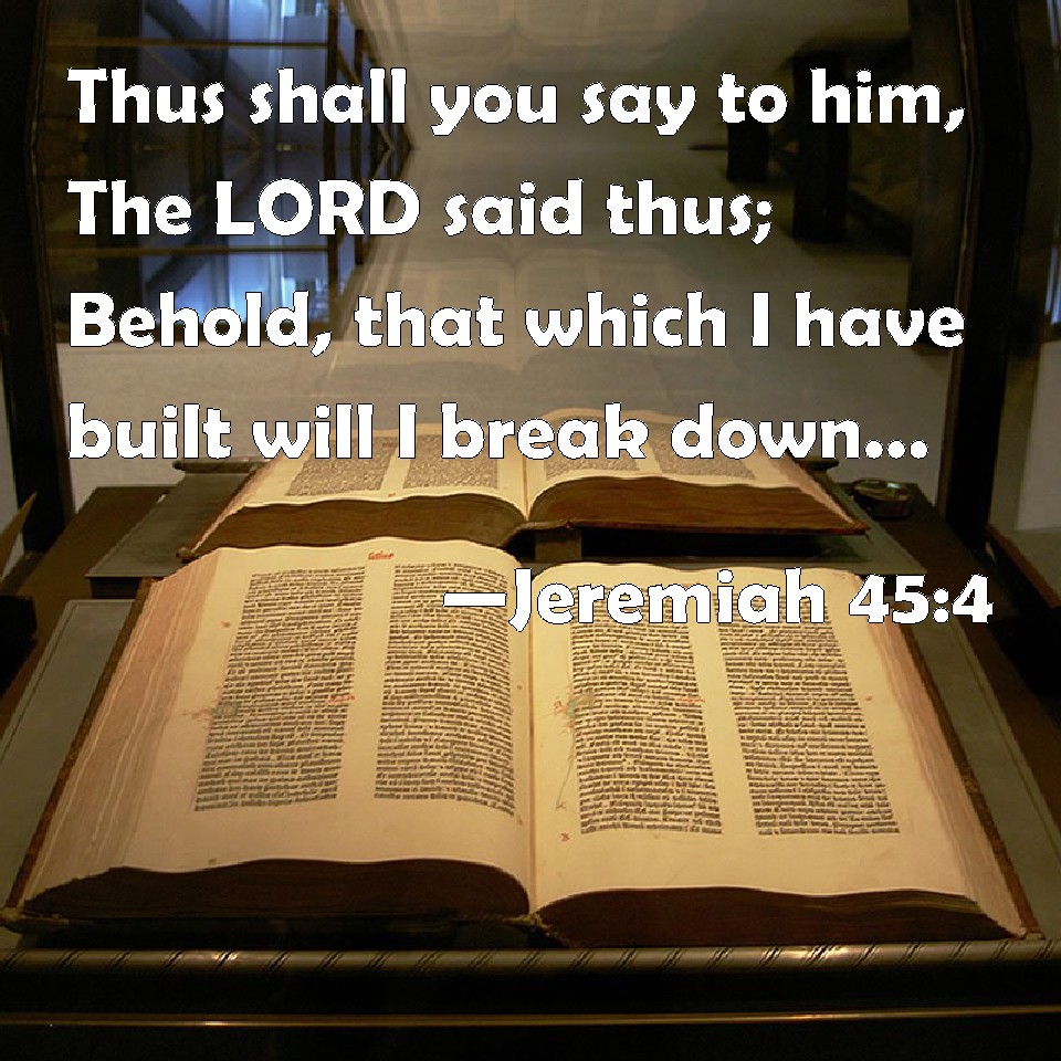 Choose a Background Jeremiah 45:4 Thus shall you say to him, The LORD said thus; Behold, that which I have built will I break down, and that which I have planted I will pluck up, even this whole land. KJV: Thus shalt thou say unto him, The LORD saith thus; Behold, that which I have built will I break down, and that which I have planted I will pluck up, even this whole land. DRB: Thus saith the Lord: Thus shalt thou say to him: Behold, them whom I have built, I do destroy: and them whom I have planted, I do pluck up, and all this land. DBT: Thus shalt thou say unto him, Thus saith Jehovah: Behold, what I have built do I overthrow, and what I have planted I pluck up, even this whole land. ERV: Thus shalt thou say unto him, Thus saith the LORD: Behold, that which I have built will I break down, and that which I have planted I will pluck up; and this in the whole land. WBT: Thus shalt thou say to him, The LORD saith thus; Behold, that which I have built I will break down, and that which I have planted I will pluck up, even this whole land. WEB: You shall tell him, Thus says Yahweh: Behold, that which I have built will I break down, and that which I have planted I will pluck up; and this in the whole land. YLT: Thus dost thou say unto him: Thus said Jehovah: Lo, that which I have built I am throwing down, and that which I have planted I am plucking up, even the whole land itself.Links Jeremiah 45:4 NIV • Jeremiah 45:4 NLT • Jeremiah 45:4 ESV • Jeremiah 45:4 NASB • Jeremiah 45:4 KJV • Jeremiah 45:4 Interlinear • Jeremiah 45:4 Commentaries • Jeremiah 45:4 Parallel Texts • Jeremiah 45:4 Bible Apps • Jeremiah 45:4 Parallel • Bible Hub |