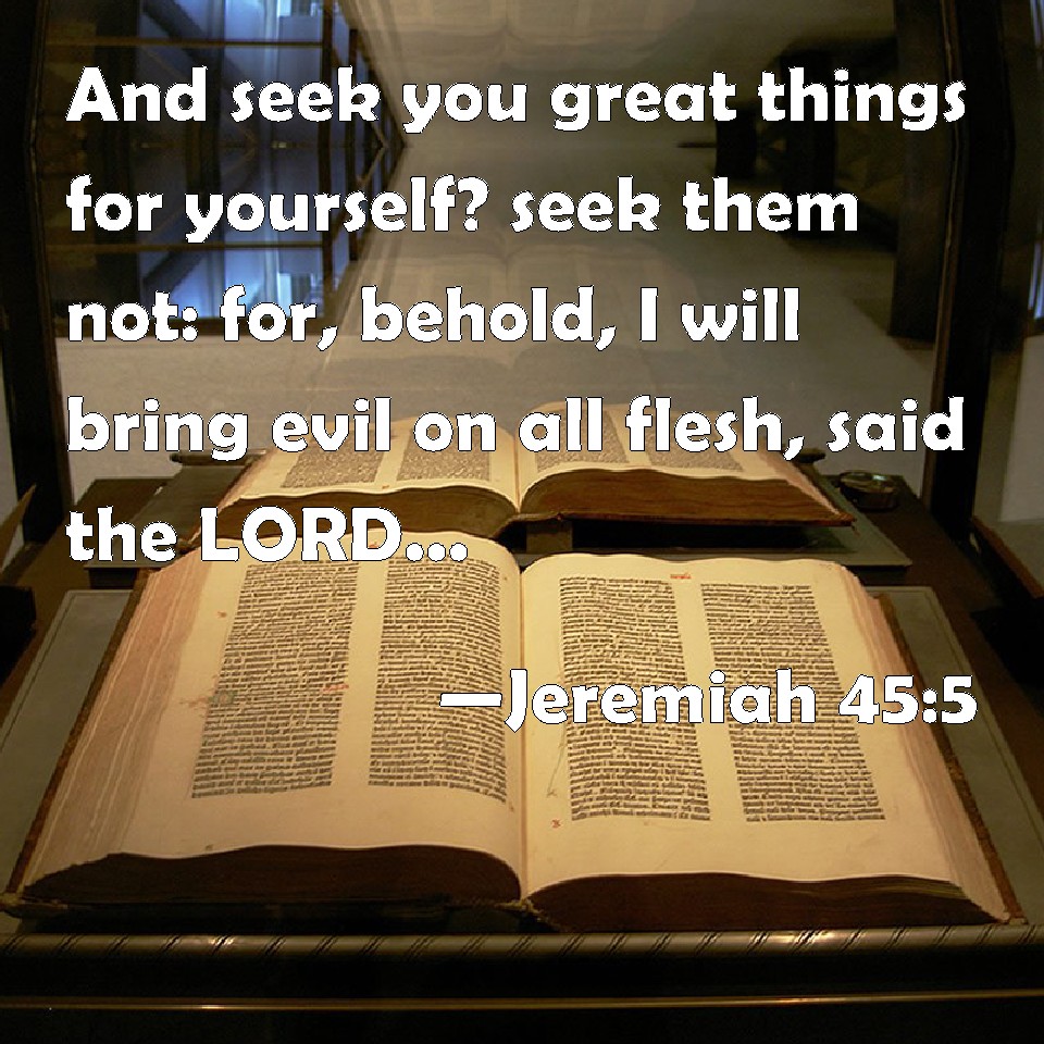 Choose a Background Jeremiah 45:5 And seek you great things for yourself? seek them not: for, behold, I will bring evil on all flesh, said the LORD: but your life will I give to you for a prey in all places where you go. KJV: And seekest thou great things for thyself? seek them not: for, behold, I will bring evil upon all flesh, saith the LORD: but thy life will I give unto thee for a prey in all places whither thou goest. DRB: And dost thou seek great things for thyself ? Seek not : for behold I will bring evil upon all flesh, saith the Lord ! but I will give thee thy life, and save thee in all places whithersoever thou shalt go. DBT: And seekest thou great things for thyself? seek them not; for behold, I will bring evil upon all flesh, saith Jehovah; but thy life will I give unto thee for a prey in all places whither thou shalt go. ERV: And seekest thou great things for thyself? seek them not: for, behold, I will bring evil upon all flesh, saith the LORD: but thy life will I give unto thee for a prey in all places whither thou goest. WBT: And seekest thou great things for thyself? seek them not: for behold, I will bring evil upon all flesh, saith the LORD: but thy life will I give to thee for a prey in all places whither thou goest. WEB: Do you seek great things for yourself? Don't seek them; for, behold, I will bring evil on all flesh, says Yahweh; but your life will I give to you for a prey in all places where you go. YLT: And thou — thou seekest for thee great things — do not seek, for lo, I am bringing in evil on all flesh — an affirmation of Jehovah — and I have given to thee thy life for a spoil, in all places whither thou goest.'Links Jeremiah 45:5 NIV • Jeremiah 45:5 NLT • Jeremiah 45:5 ESV • Jeremiah 45:5 NASB • Jeremiah 45:5 KJV • Jeremiah 45:5 Interlinear • Jeremiah 45:5 Commentaries • Jeremiah 45:5 Parallel Texts • Jeremiah 45:5 Bible Apps • Jeremiah 45:5 Parallel • Bible Hub |