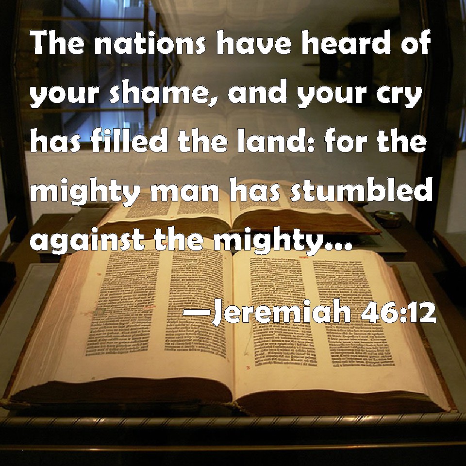 Choose a Background Jeremiah 46:12 The nations have heard of your shame, and your cry has filled the land: for the mighty man has stumbled against the mighty, and they are fallen both together. KJV: The nations have heard of thy shame, and thy cry hath filled the land: for the mighty man hath stumbled against the mighty, and they are fallen both together. DRB: The nations have heard of thy disgrace, and thy howling hath filled the land: for the strong hath stumbled against the strong, and both are fallen together. DBT: The nations have heard of thy shame, and thy cry hath filled the earth; for the mighty man stumbleth against the mighty, they are both fallen together. ERV: The nations have heard of thy shame, and the earth is full of thy cry: for the mighty man hath stumbled against the mighty, they are fallen both of them together. WBT: The nations have heard of thy shame, and thy cry hath filled the land: for the mighty man hath stumbled against the mighty, and they have fallen both together. WEB: The nations have heard of your shame, and the earth is full of your cry; for the mighty man has stumbled against the mighty, they are fallen both of them together. YLT: Nations have heard of thy shame, And thy cry hath filled the land, For the mighty on the mighty did stumble, Together they have fallen — both of them!'Links Jeremiah 46:12 NIV • Jeremiah 46:12 NLT • Jeremiah 46:12 ESV • Jeremiah 46:12 NASB • Jeremiah 46:12 KJV • Jeremiah 46:12 Interlinear • Jeremiah 46:12 Commentaries • Jeremiah 46:12 Parallel Texts • Jeremiah 46:12 Bible Apps • Jeremiah 46:12 Parallel • Bible Hub |