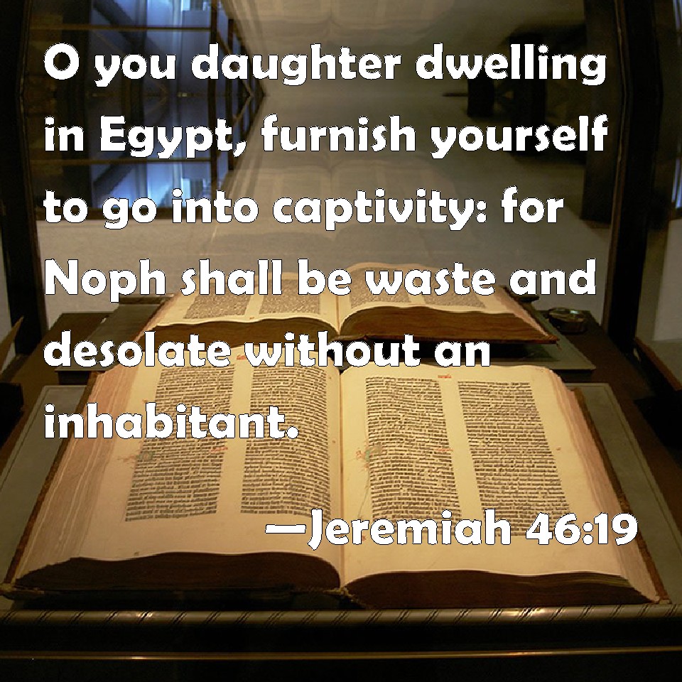 Choose a Background Jeremiah 46:19 O you daughter dwelling in Egypt, furnish yourself to go into captivity: for Noph shall be waste and desolate without an inhabitant. KJV: O thou daughter dwelling in Egypt, furnish thyself to go into captivity: for Noph shall be waste and desolate without an inhabitant. DRB: Furnish thyself to go into captivity, thou daughter inhabitant of Egypt: for Memphis shall be made desolate, and shall be forsaken and uninhabited. DBT: Thou, inhabitress, daughter of Egypt, furnish for thyself a captive's baggage, for Noph shall be a desolation and shall be ruined, so that none shall dwell therein. ERV: O thou daughter that dwellest in Egypt, furnish thyself to go into captivity: for Noph shall become a desolation, and shall be burnt up, without inhabitant. WBT: O thou daughter dwelling in Egypt, furnish thyself to go into captivity: for Noph shall be waste and desolate without an inhabitant. WEB: You daughter who dwells in Egypt, furnish yourself to go into captivity; for Memphis shall become a desolation, and shall be burnt up, without inhabitant. YLT: Goods for removal make for thee, O inhabitant, daughter of Egypt, For Noph becometh a desolation, And hath been burnt up, without inhabitant.Links Jeremiah 46:19 NIV • Jeremiah 46:19 NLT • Jeremiah 46:19 ESV • Jeremiah 46:19 NASB • Jeremiah 46:19 KJV • Jeremiah 46:19 Interlinear • Jeremiah 46:19 Commentaries • Jeremiah 46:19 Parallel Texts • Jeremiah 46:19 Bible Apps • Jeremiah 46:19 Parallel • Bible Hub |