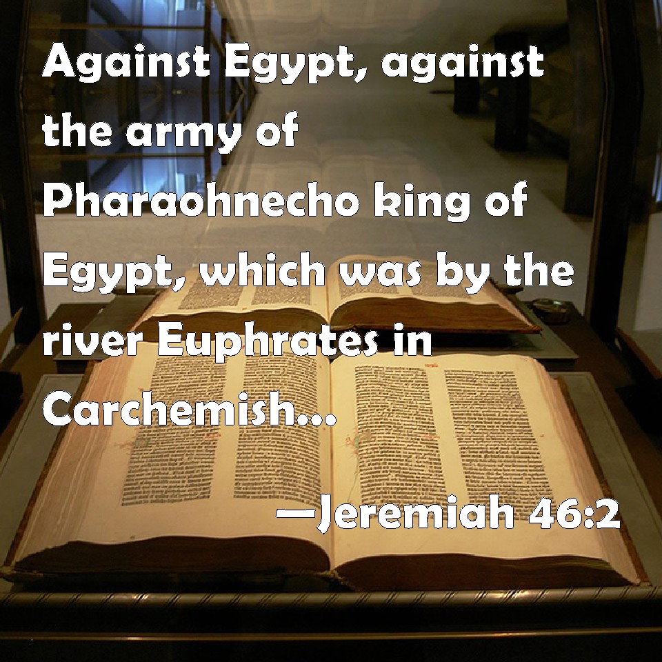 Choose a Background Jeremiah 46:2 Against Egypt, against the army of Pharaohnecho king of Egypt, which was by the river Euphrates in Carchemish, which Nebuchadrezzar king of Babylon smote in the fourth year of Jehoiakim the son of Josiah king of Judah. KJV: Against Egypt, against the army of Pharaohnecho king of Egypt, which was by the river Euphrates in Carchemish, which Nebuchadrezzar king of Babylon smote in the fourth year of Jehoiakim the son of Josiah king of Judah. DRB: Against Egypt, against the army of Pharao Nechao king of Egypt, which was by the river Euphrates in Charcamis, whom Nabuchodonosor the king of Babylon defeated, in the fourth year of Joakim the son of Josias king of Juda. DBT: Of Egypt: concerning the army of Pharaoh-Necho king of Egypt, which was by the river Euphrates at Carchemish, which Nebuchadrezzar king of Babylon smote in the fourth year of Jehoiakim the son of Josiah, the king of Judah. ERV: Of Egypt: concerning the army of Pharaoh-neco, king of Egypt, which was by the river Euphrates in Carchemish, which Nebuchadrezzar king of Babylon smote in the fourth year of Jehoiakim the son of Josiah, king of Judah. WBT: Against Egypt, against the army of Pharaoh-necho king of Egypt, who was by the river Euphrates in Carshemish, whom Nebuchadrezzar king of Babylon smote in the fourth year of Jehoiakim the son of Josiah king of Judah. WEB: Of Egypt: concerning the army of Pharaoh Necoh king of Egypt, which was by the river Euphrates in Carchemish, which Nebuchadnezzar king of Babylon struck in the fourth year of Jehoiakim the son of Josiah, king of Judah. YLT: For Egypt, concerning the force of Pharaoh-Necho king of Egypt, that hath been by the river Phrat, in Carchemish, that Nebuchadrezzar king of Babylon hath smitten, in the fourth year of Jehoiakim son of Josiah king of Judah:Links Jeremiah 46:2 NIV • Jeremiah 46:2 NLT • Jeremiah 46:2 ESV • Jeremiah 46:2 NASB • Jeremiah 46:2 KJV • Jeremiah 46:2 Interlinear • Jeremiah 46:2 Commentaries • Jeremiah 46:2 Parallel Texts • Jeremiah 46:2 Bible Apps • Jeremiah 46:2 Parallel • Bible Hub |