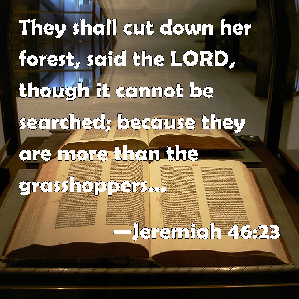 Choose a Background Jeremiah 46:23 They shall cut down her forest, said the LORD, though it cannot be searched; because they are more than the grasshoppers, and are innumerable. KJV: They shall cut down her forest, saith the LORD, though it cannot be searched; because they are more than the grasshoppers, and are innumerable. DRB: They have cut down her forest, saith the Lord, which cannot be counted: they are multiplied above locusts, and are without number. DBT: They shall cut down her forest, saith Jehovah, though it be impenetrable; for they are more than the locusts, and are innumerable. ERV: They shall cut down her forest, saith the LORD, though it cannot be searched; because they are more than the locusts, and are innumerable. WBT: They shall cut down her forest, saith the LORD, though it cannot be searched; because they are more than the grasshoppers, and are innumerable. WEB: They shall cut down her forest, says Yahweh, though it can't be searched; because they are more than the locusts, and are innumerable. YLT: They have cut down her forest, An affirmation of Jehovah — for it is not searched, For they have been more than the grasshopper, And they have no numbering.Links Jeremiah 46:23 NIV • Jeremiah 46:23 NLT • Jeremiah 46:23 ESV • Jeremiah 46:23 NASB • Jeremiah 46:23 KJV • Jeremiah 46:23 Interlinear • Jeremiah 46:23 Commentaries • Jeremiah 46:23 Parallel Texts • Jeremiah 46:23 Bible Apps • Jeremiah 46:23 Parallel • Bible Hub |