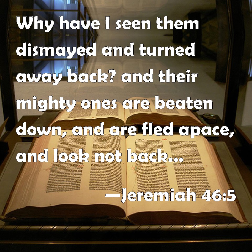 Choose a Background Jeremiah 46:5 Why have I seen them dismayed and turned away back? and their mighty ones are beaten down, and are fled apace, and look not back: for fear was round about, said the LORD. KJV: Wherefore have I seen them dismayed and turned away back? and their mighty ones are beaten down, and are fled apace, and look not back: for fear was round about, saith the LORD. DRB: What then? I have seen them dismayed, and turning their backs, their valiant ones slain: they fled apace, and they looked not back: terror was round about, saith the Lord. DBT: Why do I see them dismayed, turned away back? And their mighty ones are beaten down, and take to flight, and look not back? Terror is on every side, saith Jehovah. ERV: Wherefore have I seen it? they are dismayed and are turned backward; and their mighty ones are beaten down, and are fled apace, and look not back: terror is on every side, saith the LORD. WBT: Why have I seen them dismayed and turned away back? and their mighty ones are beaten down, and have fled apace, and look not back: for fear was on all sides, saith the LORD. WEB: Why have I seen it? they are dismayed and are turned backward; and their mighty ones are beaten down, and have fled apace, and don't look back: terror is on every side, says Yahweh. YLT: Wherefore have I seen them dismayed — They are turned backward, And their mighty ones are beaten down, And to a refuge they have fled, and not turned the face? Fear is round about — an affirmation of Jehovah.Links Jeremiah 46:5 NIV • Jeremiah 46:5 NLT • Jeremiah 46:5 ESV • Jeremiah 46:5 NASB • Jeremiah 46:5 KJV • Jeremiah 46:5 Interlinear • Jeremiah 46:5 Commentaries • Jeremiah 46:5 Parallel Texts • Jeremiah 46:5 Bible Apps • Jeremiah 46:5 Parallel • Bible Hub |