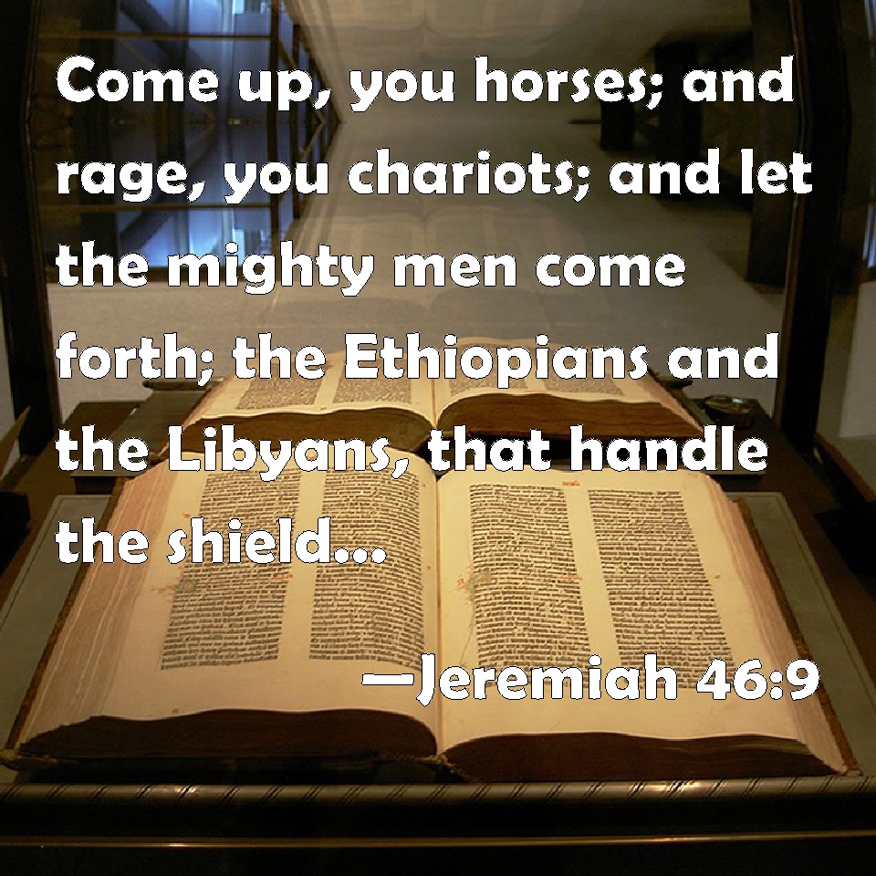 Choose a Background Jeremiah 46:9 Come up, you horses; and rage, you chariots; and let the mighty men come forth; the Ethiopians and the Libyans, that handle the shield; and the Lydians, that handle and bend the bow. KJV: Come up, ye horses; and rage, ye chariots; and let the mighty men come forth; the Ethiopians and the Libyans, that handle the shield; and the Lydians, that handle and bend the bow. DRB: Get ye up on horses, and glory in chariots, and let the valiant men come forth, the Ethiopians, and the Libyans that hold the shield, and the Lydians that take, and shoot arrows. DBT: Go up, ye horses, and drive furiously, ye chariots; and let the mighty men go forth: Cush and Phut that handle the shield, and the Ludim that handle the bow and bend it. ERV: Go up, ye horses; and rage, ye chariots; and let the mighty men go forth: Cush and Put, that handle the shield; and the Ludim, that handle and bend the bow. WBT: Come up, ye horses; and rage, ye chariots; and let the mighty men come forth: the Cushites and the Libyans, that handle the shield; and the Lydians that handle and bend the bow. WEB: Go up, you horses; and rage, you chariots; and let the mighty men go forth: Cush and Put, who handle the shield; and the Ludim, who handle and bend the bow. YLT: Go up, ye horses; and boast yourselves, ye chariots, And go forth, ye mighty, Cush and Phut handling the shield, And Lud handling — treading the bow.Links Jeremiah 46:9 NIV • Jeremiah 46:9 NLT • Jeremiah 46:9 ESV • Jeremiah 46:9 NASB • Jeremiah 46:9 KJV • Jeremiah 46:9 Interlinear • Jeremiah 46:9 Commentaries • Jeremiah 46:9 Parallel Texts • Jeremiah 46:9 Bible Apps • Jeremiah 46:9 Parallel • Bible Hub |